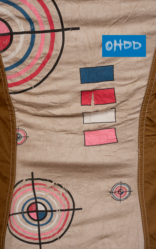 Jacket with detachable sleeves made of crinkle-effect cotton, constructed from contrasting panels in beige and off-white tones, with exposed stitching that defines its structure. Front closure with small snap buttons applied on colored ribbons, the same ones that allow you to detach and attach the sleeves, functional elements that become a decorative detail. On the back, a stretch fabric panel becomes the canvas on which you’ll find the exclusive multicolor Ohdd print, applied directly to the garment, completing the design with a distinctive mark.