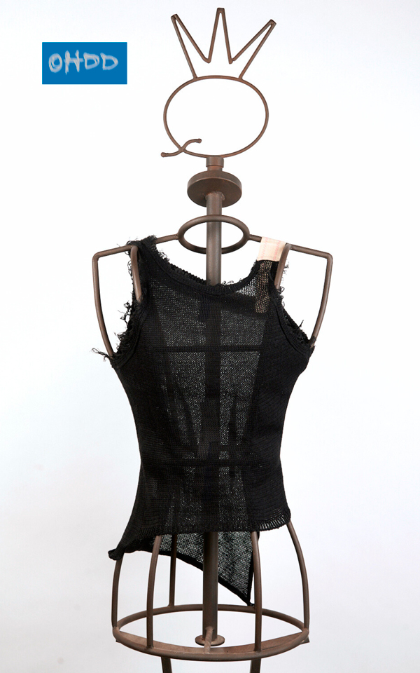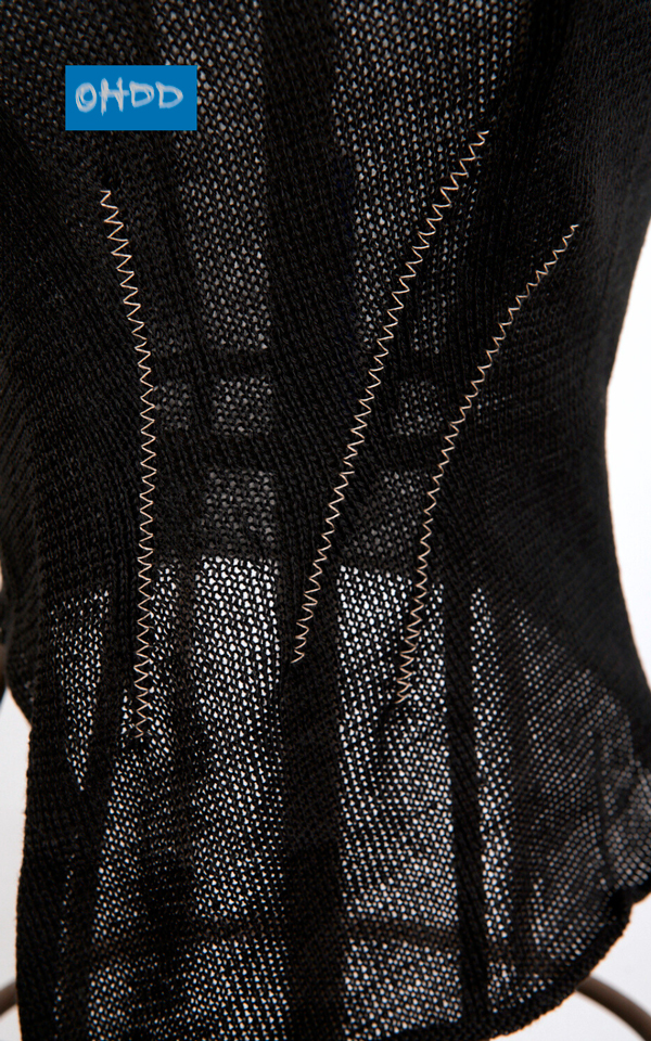 Black hemp knit top, embellished with embroidery and right shoulder strap in contrasting fabric. Asymmetrical neckline and front hem, with crew neck and armhole finished with frayed effect. The front neckline and back hem are ribbed, defining the garment’s design.