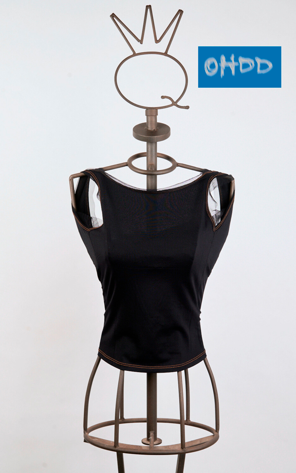 Black stretch fabric top, enhanced by double ochre stitching and the exclusive Ohdd print on the elastic tulle ring collar. The tulle applications define the neckline, round at the front and deep V at the back, creating an elegant play of transparencies.