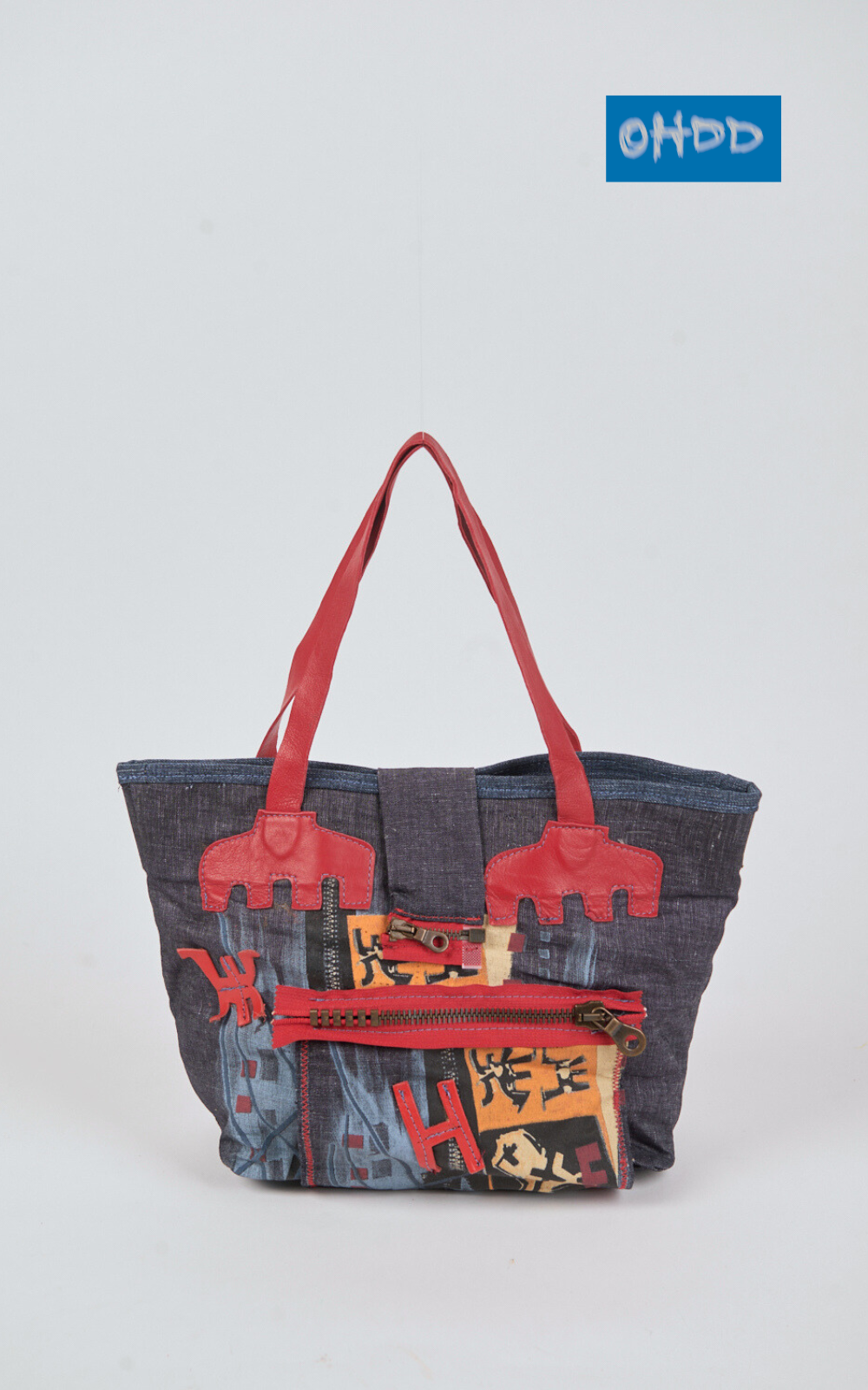 Handbag in pure denim-effect cotton with rectangular base, embellished with red leather appliqués with visible stitching and an exclusive Ohdd print. Features an external zippered pocket with logo on the front, while the interior is lined in the same fabric and includes a pocket. The bag closes at the front with a small zipper applied on a fabric band, and is completed with red leather handles.