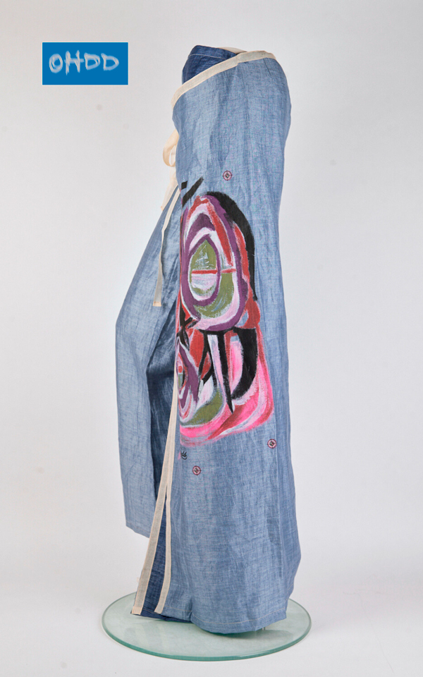 Long blue pants, creatively constructed with one leg and two panels that join with small snap buttons and then wrap around the waist, fastening with a knot. Enhanced by the exclusive multicolor Ohdd print, applied directly to the garment, which completes the design with a distinctive mark. Provided with simple instructions for wearing them correctly.