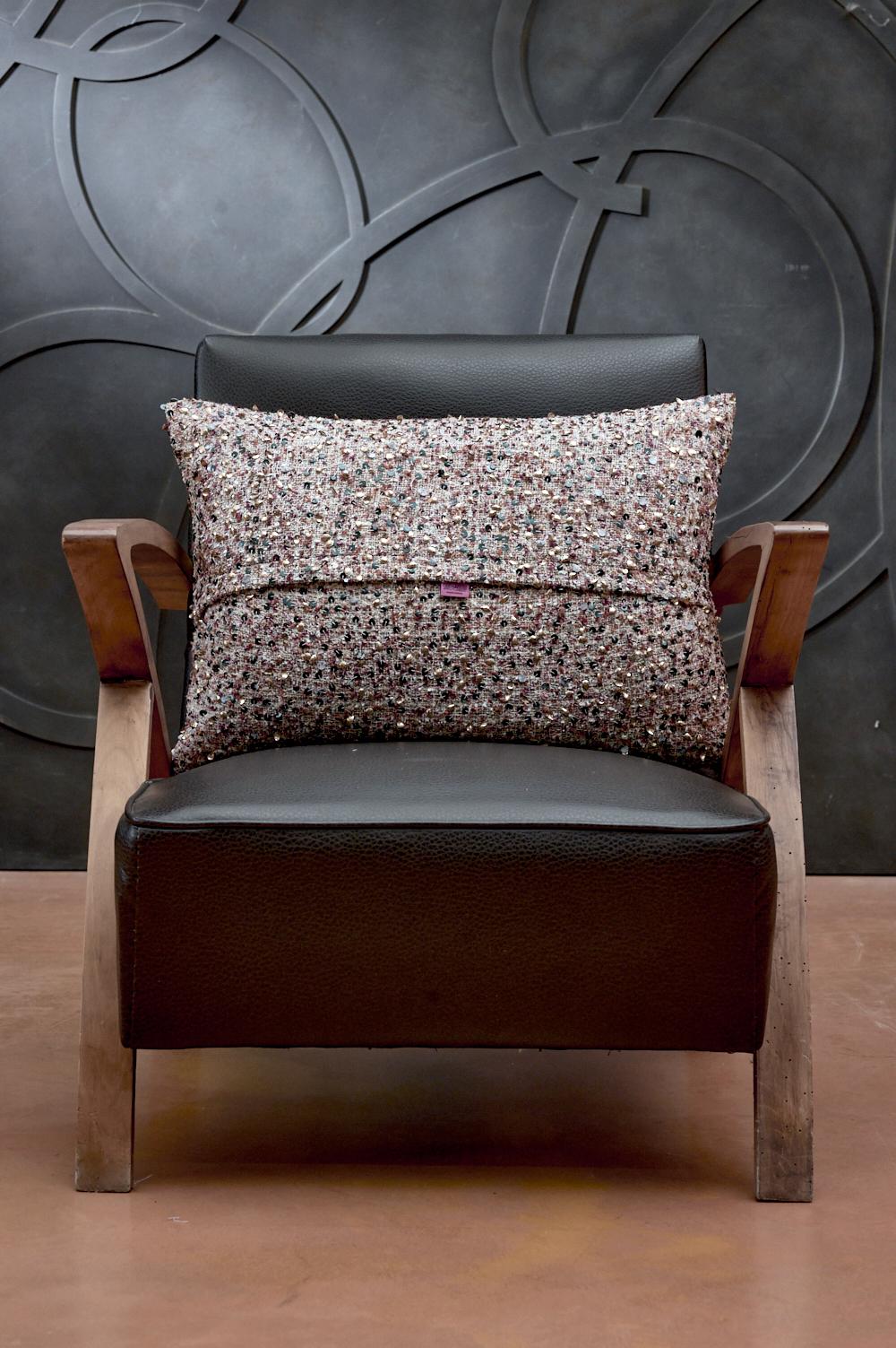 A refined accessory, crafted from silk noil in delicate shades of beige, bordeaux, and cream, enriched with dotted embroidery of gold, silver, and black sequins. Bordeaux and brown grosgrain ribbons, copper-colored applications, and lightweight crocodile pendants seal the avant-garde spirit of this model. A unique piece that brightens rooms with character and originality, bringing a touch of Italian design.