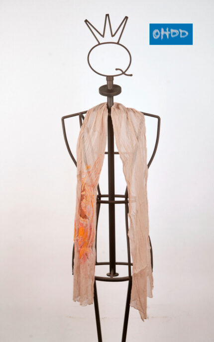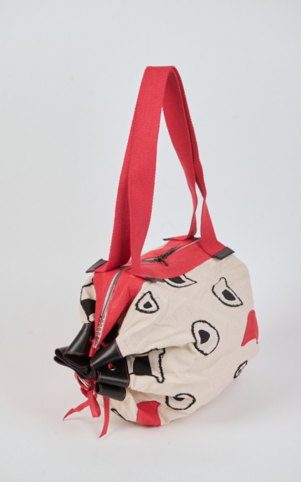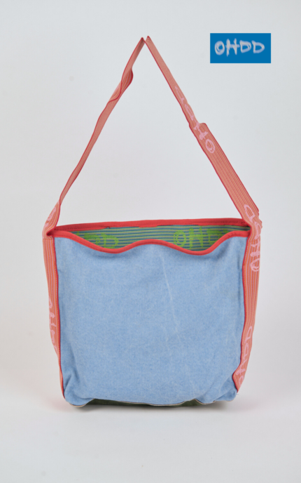 Shoulder bag in pure cotton denim with a rectangular base, designed for everyday use but with a bold graphic character. The multicolor leather appliqués, stitched with visible seams, take center stage and in some areas form the Ohdd logo. The interior, lined in red and orange striped cotton and finished with orange cotton trim, is completed by handles in thick yellow cotton fabric.