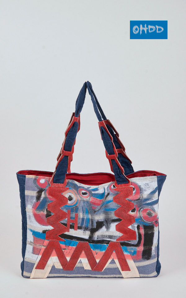 Denim-effect blue cotton handbag with pale yellow genuine leather ring handles, finished with contrasting red and blue stitching. The interior is lined in green cotton. The piece is completed by an exclusive Ohdd print on both sides and, on one side, leather appliqués in the same color as the handles and in turquoise, stitched with blue seams, for a textured and distinctive detail.