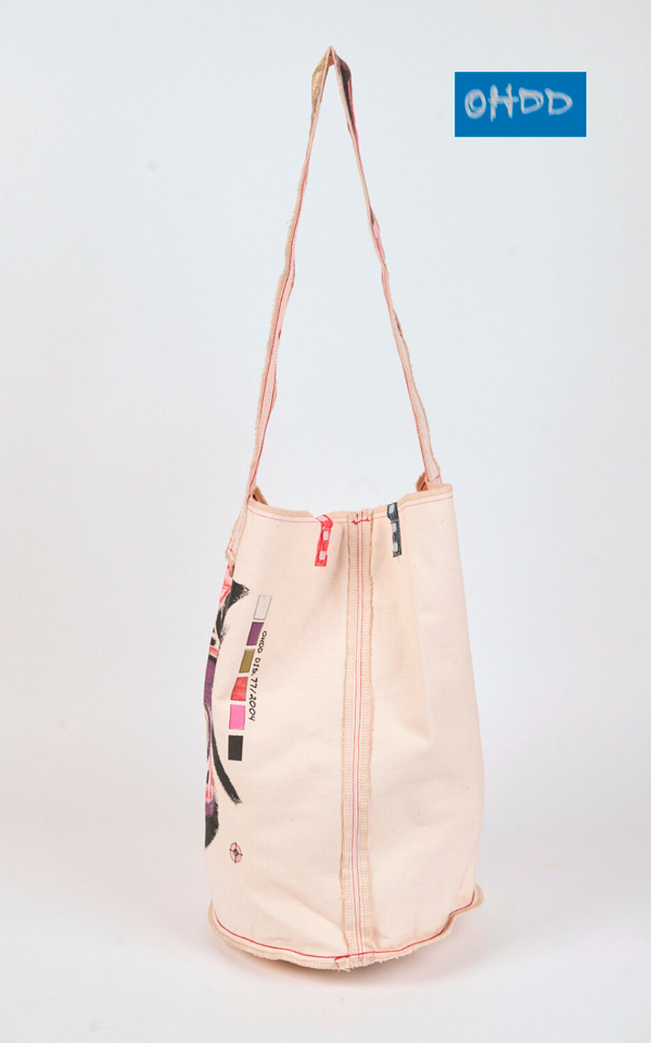 A light fabric shoulder bag with a soft, elongated shape. Features an abstract art print in shades of pink, red, black, and green on the front. Includes a long matching strap and a top closure with a colorful decorative detail near the opening.