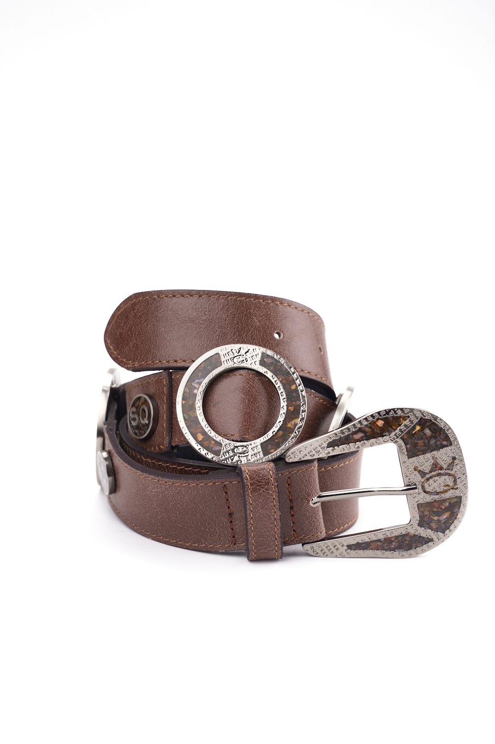 The grooves in the decorations and buckle are filled with brown glitter resin, creating a luminous, textured effect. Large oval engraved metal buckle with a Western feel, and small “SQ” logo rivets finishing the joints.