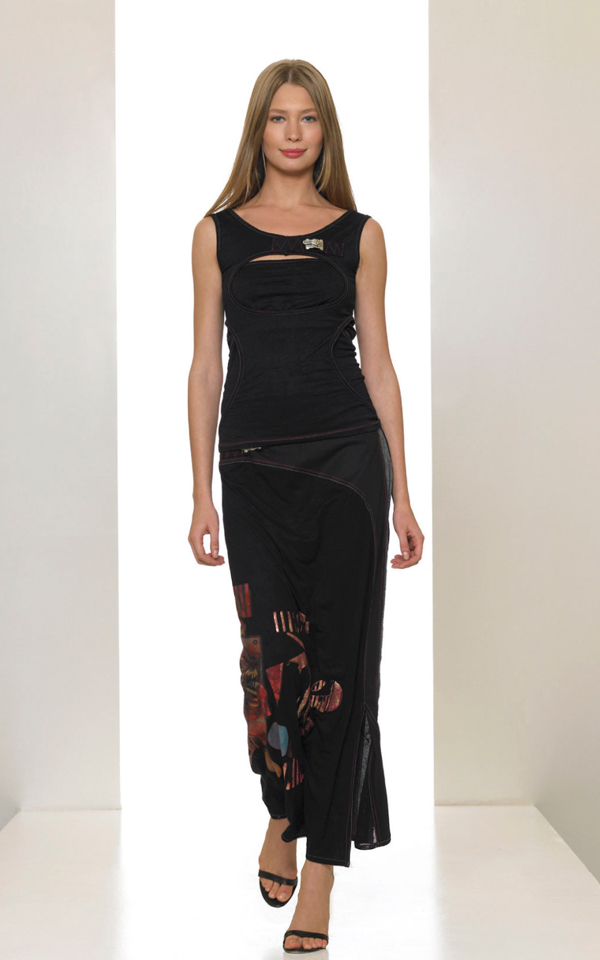 Long black viscose stretch skirt with print