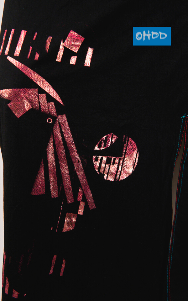 Long black viscose stretch skirt, enhanced by visible turquoise and fuchsia stitching that highlights its structure. The small side slit, together with black mesh fabric inserts and grey irregular striped fabric with a crinkled effect, adds character and movement to the garment. Completing the design, an exclusive Ohdd print with metallic reflections, while the zipper closure and branded buckle ensure a refined and distinctive detail.
