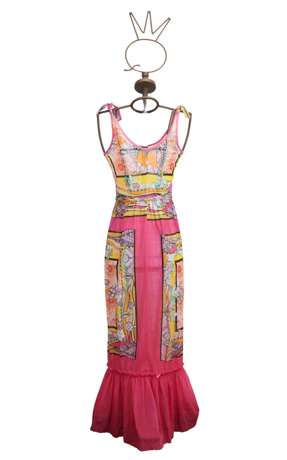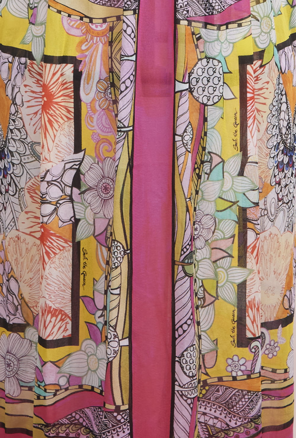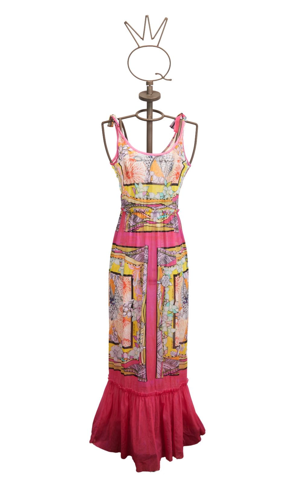Stretch tulle long dress with flounce at the bottom, embellished with a scarf-like print that makes the dress very exclusive. The floral print plays on the same shades as the series – fuchsia, acid green, yellow and orange – for a harmonious and dramatic color effect.