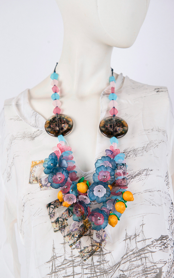PVC necklace featuring floral and lemon decorative elements for a vibrant, sunny look. The ideal accessory to complete “Positano” themed looks, enhancing tops and printed garments with a coordinated, signature touch.