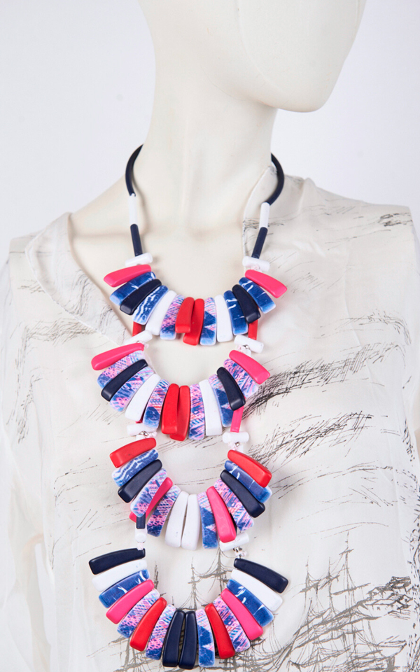 PVC necklace with printed pendants forming 4 half-moons, in pink and purple tones that characterize the line. A lightweight and eye-catching accessory, perfect for adding a touch of color to your look and creating coordinated combinations with pieces of the same inspiration.