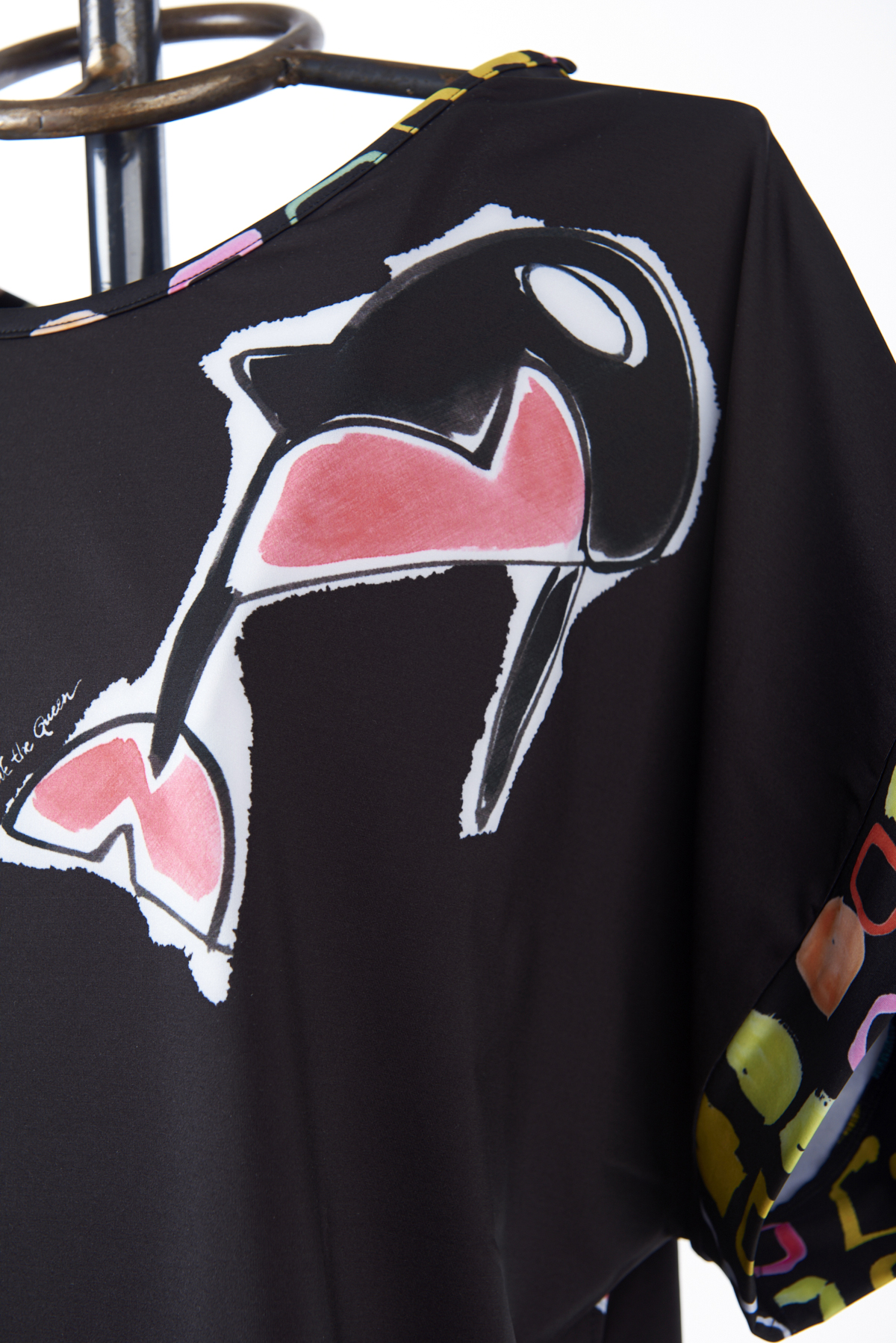 A tunic made of printed lycra with exclusive Save The Queen! patterns, one geometric and the other dedicated to a cute shark,. Yellow, pink and light blue predominate on a black base. Perfect to wear paired with a swimsuit with the same pattern.