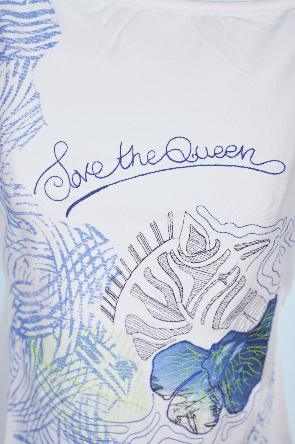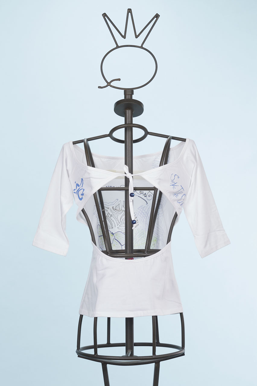 White T-shirt with print and embroidery on the front laced behind the neck.