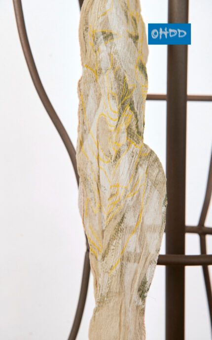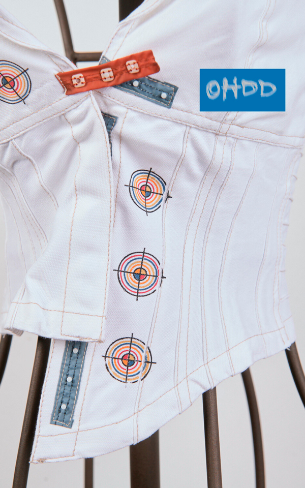 Sleeveless white cotton jacket, crafted with overlapping panels and visible stitching that define a graceful silhouette. It features a halter neck and a partially open back. The front closure features snap buttons on colored ribbons, serving both a decorative and functional purpose. The garment is embellished with multicolored prints.