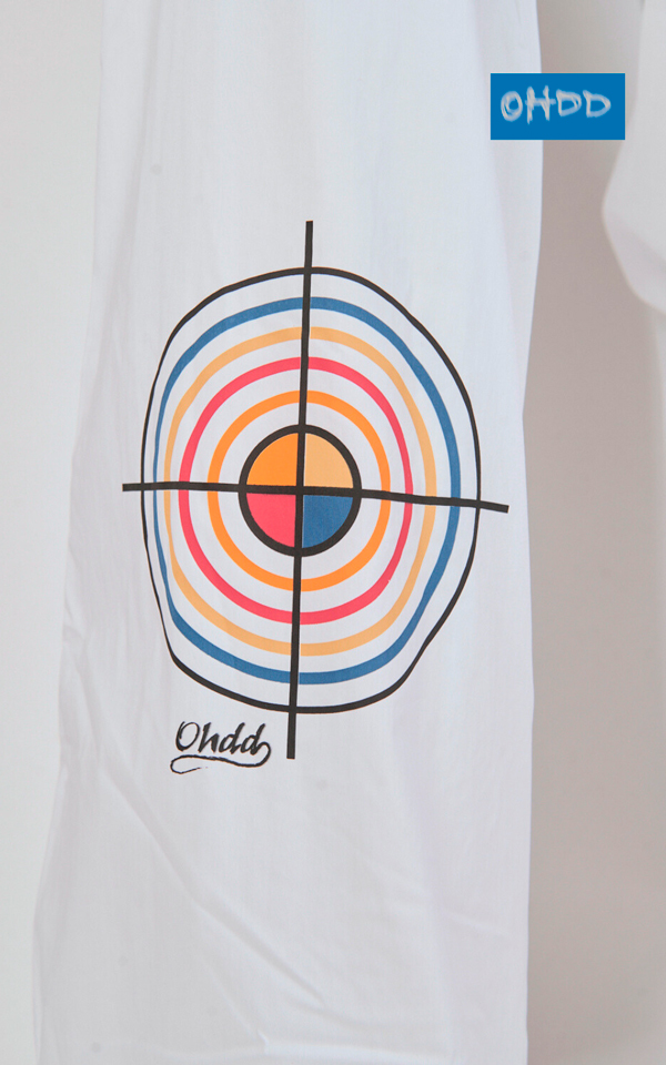 White stretch cotton pants with wide legs and topstitching. The high waistband, crafted from a structured fabric, features two large loops for a half-belt attached to the right side and fastened on the left with snap buttons. A right-side zipper ensures a comfortable fit. The garment is embellished with exclusive Ohdd multicolored prints.