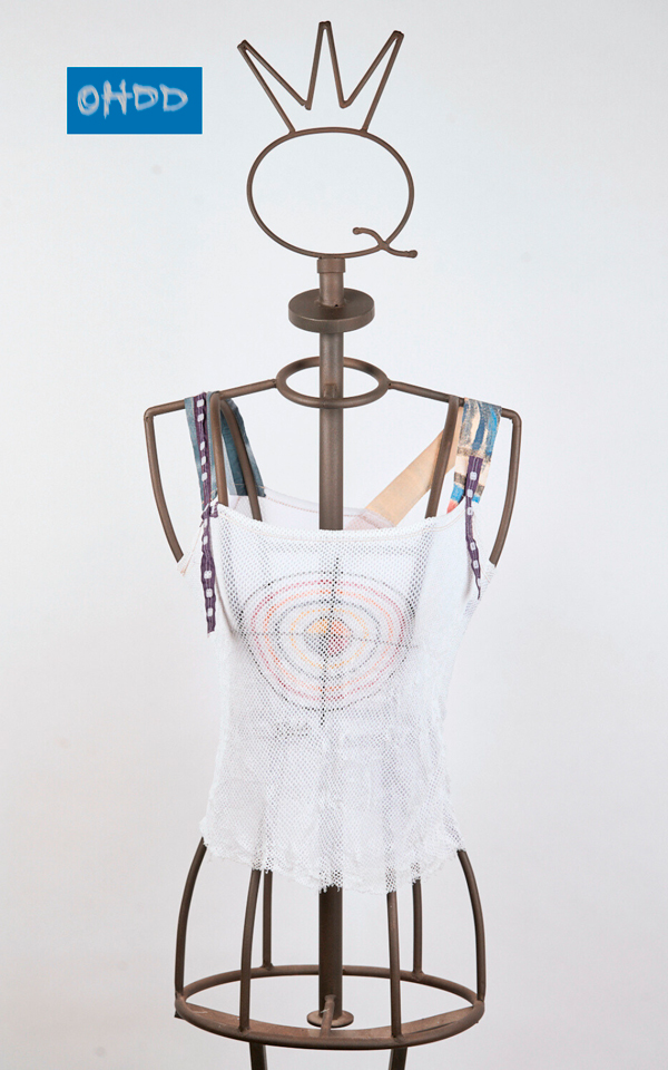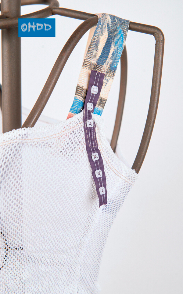 White double-layer top, composed of a tulle layer with exclusive Ohdd print, covered by a soft stretch mesh fabric. Finished with exposed seams, it features printed adjustable straps with small snap buttons applied on colored ribbons, combining function and decoration.