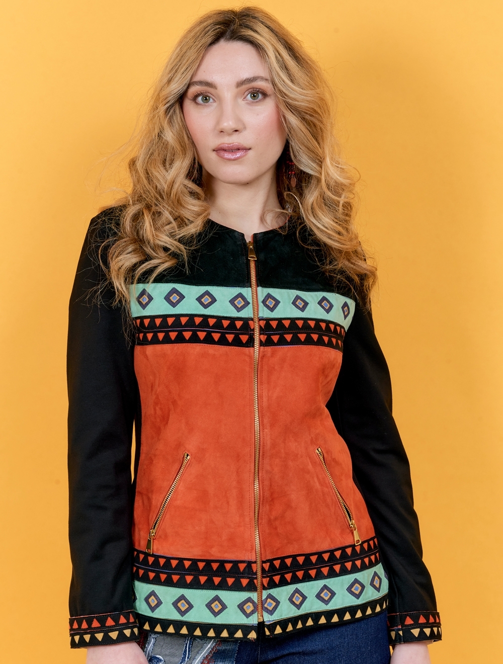A black and orange jacket. The cuffs and front are in leather, while the sleeves and back are in fabric. Round neckline, front pockets with zip. It closes on the front with a zip.