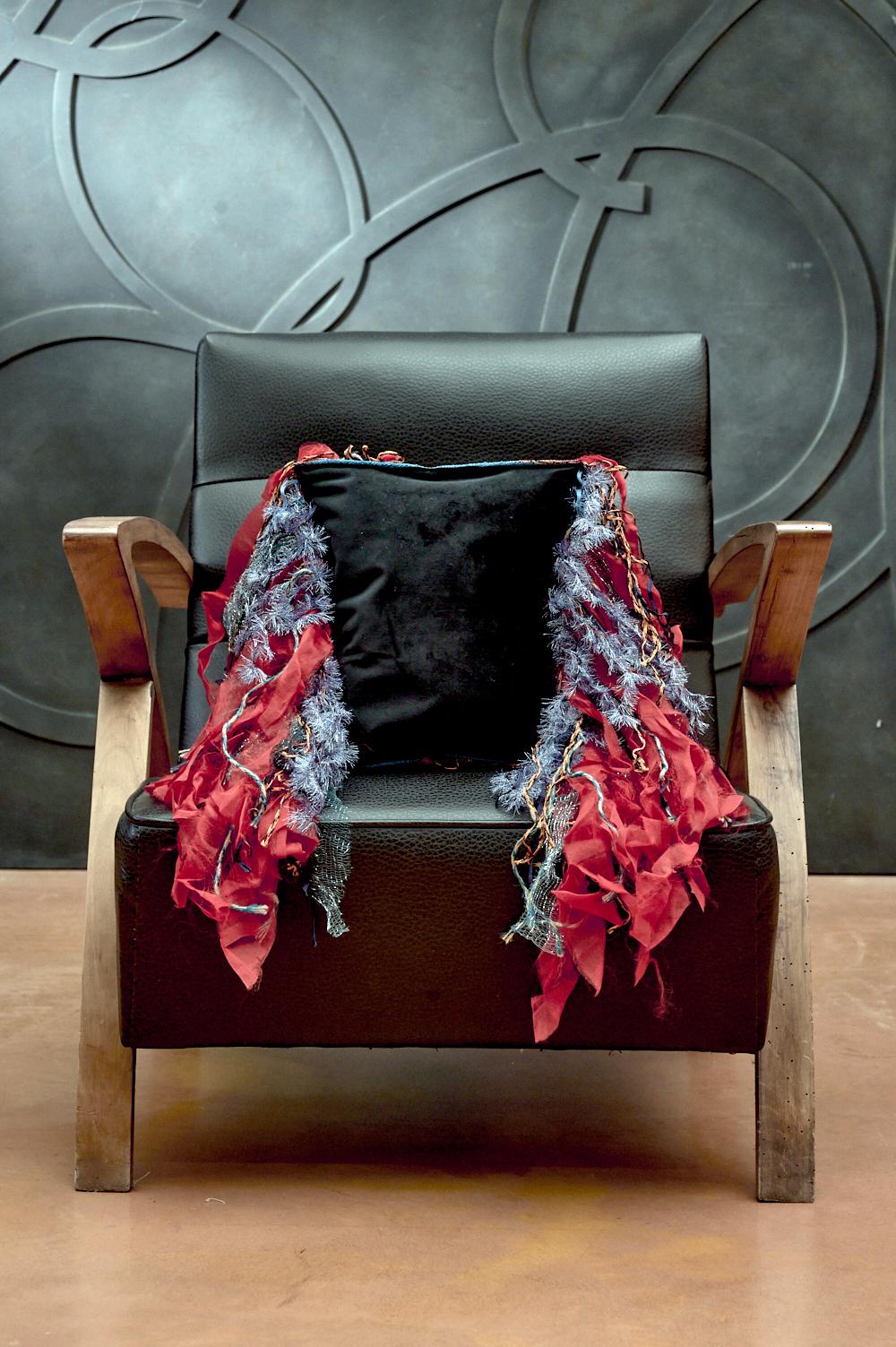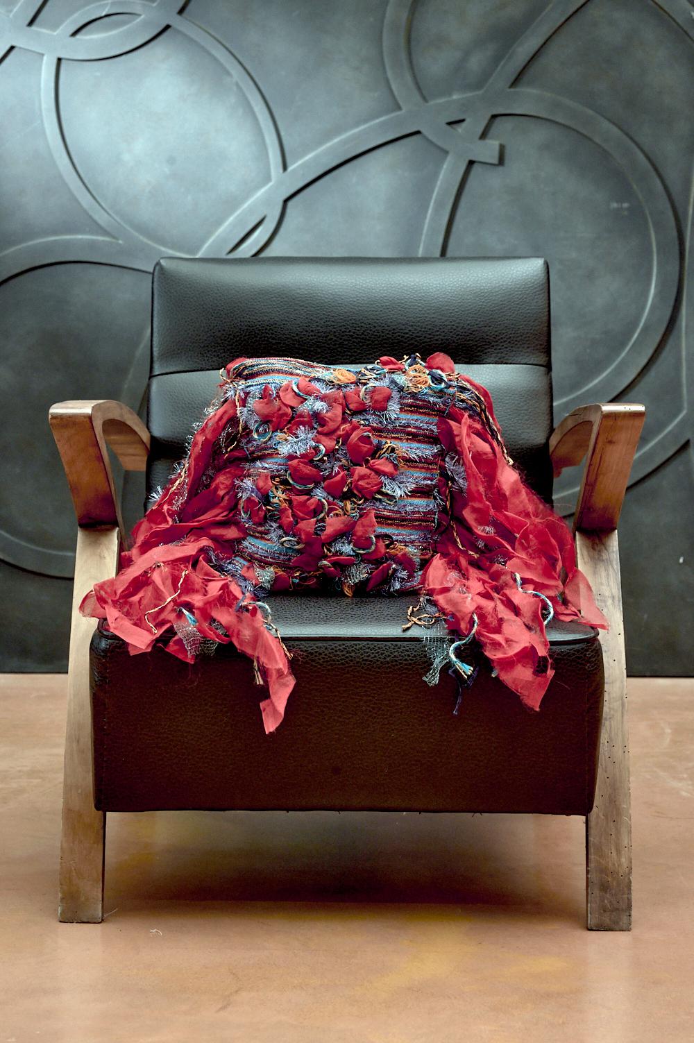 This compact yet bold cushion is crafted using refined 17th-century Florentine techniques, with silk waste and precious artisanal applications in a vibrant red hue. Its rich, tactile and artistic effect results from the combination of fine yarns and embroidery, where silk blends with viscose to ensure softness, sheen and perfect color harmony. The dominant red tone, enhanced by dark and metallic accents, adds depth and movement.