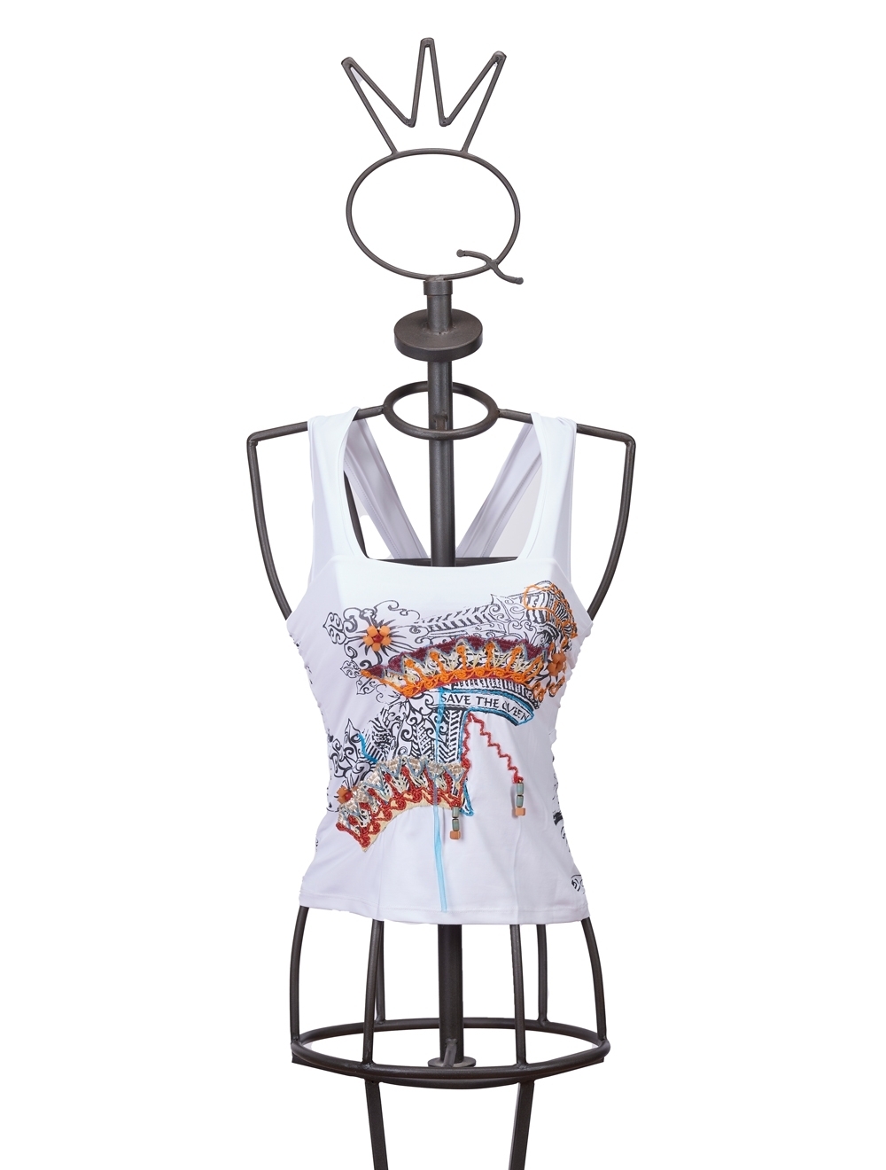 A white top in stretch fabric with print, embroidery and beaded applications in the prevailing shades of orange, black and turquoise. Wide straps, bra band that ties behind the back.