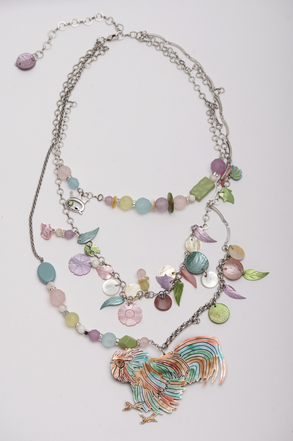 Un collier à trois brins très spécial avec des accessoires multicolores. Au centre, un médaillon rond représentant un coq émaillé, œuvre d’artisans italiens.