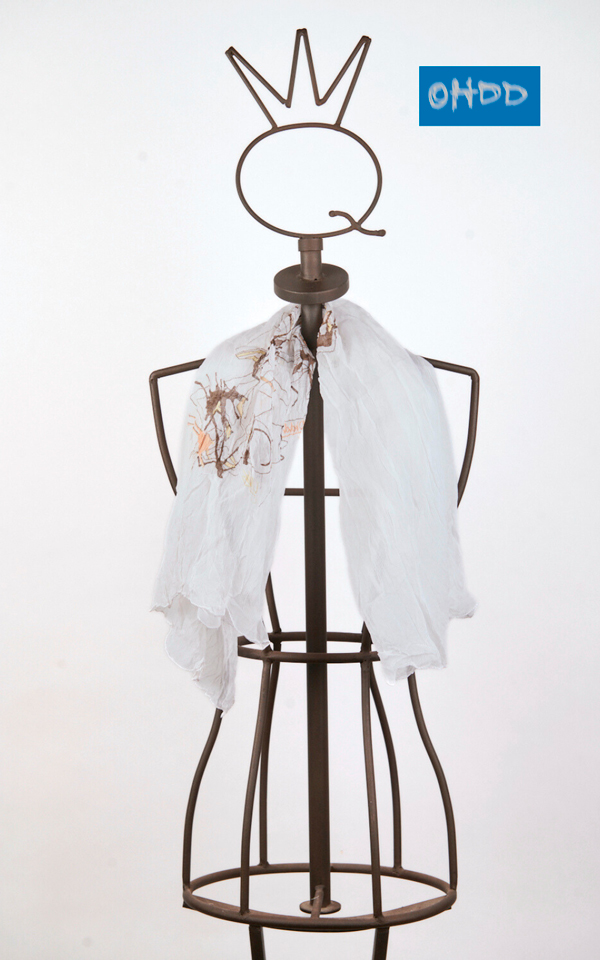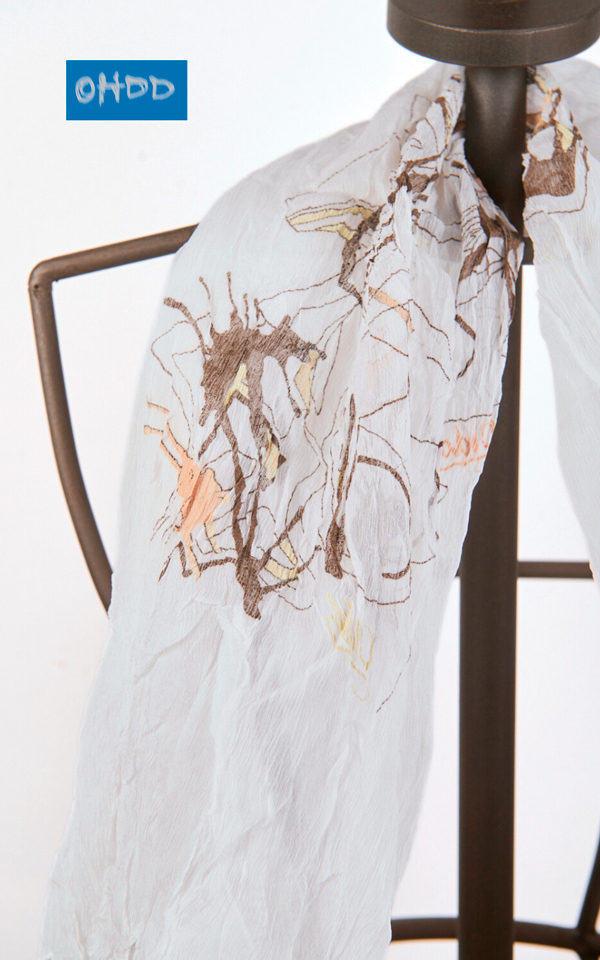 Foulard en précieux crêpon de soie dans les tons blancs, fini avec un ourlet roulotté réalisé à la main et embelli d’un imprimé exclusif Ohdd.