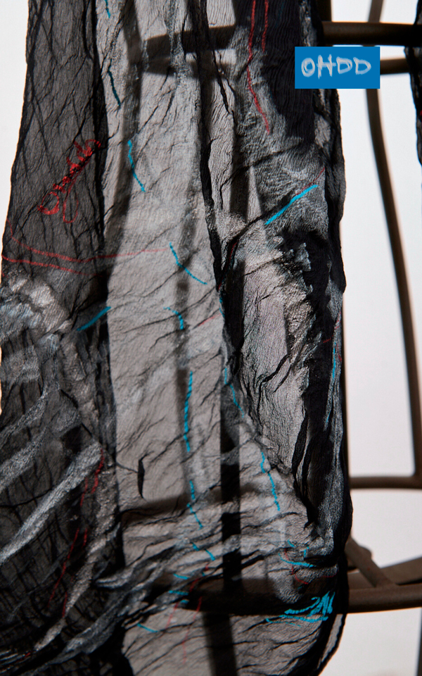 Foulard en précieux crépon de soie noir, fini avec un ourlet roulotté à la main et agrémenté d’un imprimé exclusif Ohdd.
