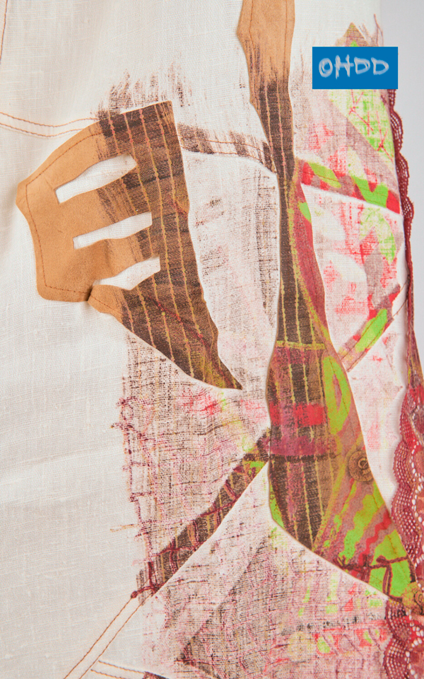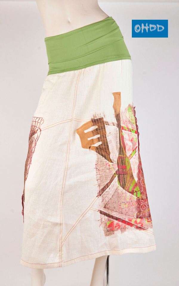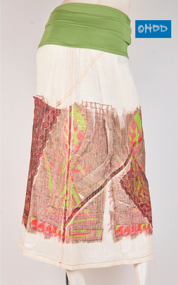 Jupe longue en lin, complétée par une ceinture en tissu stretch vert et entièrement finie avec des surpiqûres couleur ocre. La pièce est enrichie de diverses applications en dentelle, tulle et cuir véritable, mises en valeur par les imprimés exclusifs Ohdd.