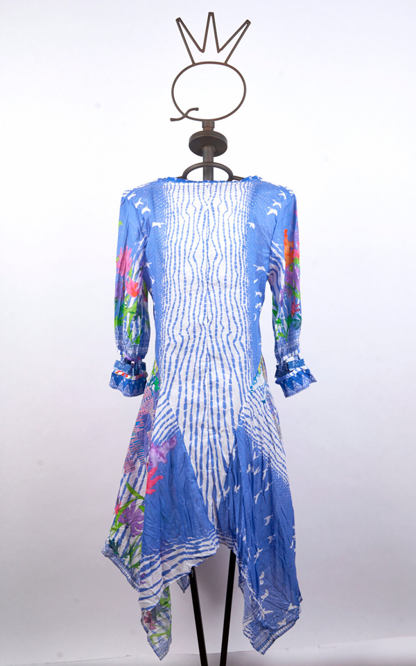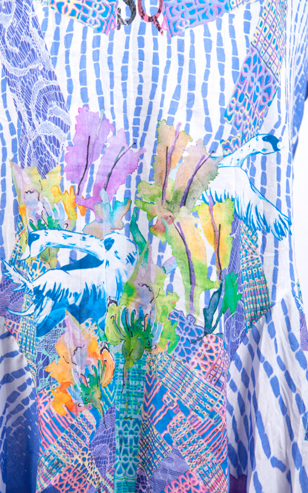 Robe asymétrique en mousseline de coton imprimé « Cygne », légère et aérienne, caractérisée par une grande ampleur qui apporte du mouvement et une coupe souple. Le modèle présente des manches 3/4 et un bas asymétrique qui augmente la liberté de mouvement et ajoute de la féminité ; le design est complété par des détails/accessoires appliqués qui enrichissent la pièce et la rendent distinctive.