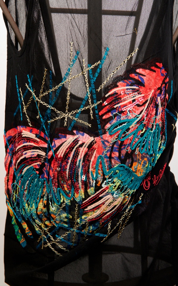 Top noir en tulle stretch, léger et féminin, doublé sur le devant pour plus d’opacité et défini par une confection soignée dans les moindres détails. La pièce est sublimée par une broderie de coq multicolore au rendu précieux et artistique, conçue pour devenir le point focal du look : une véritable déclaration de style, à porter avec des essentiels ou en contraste.