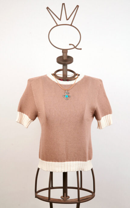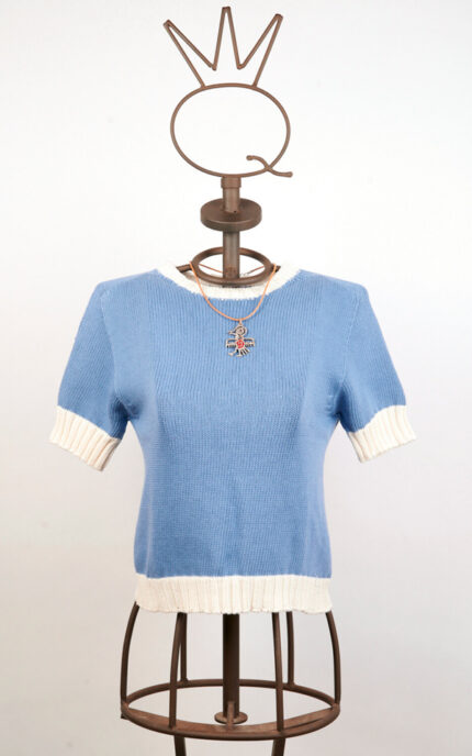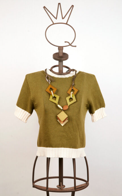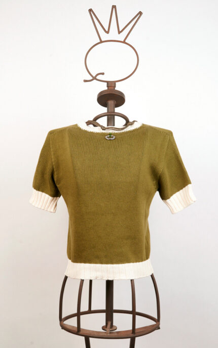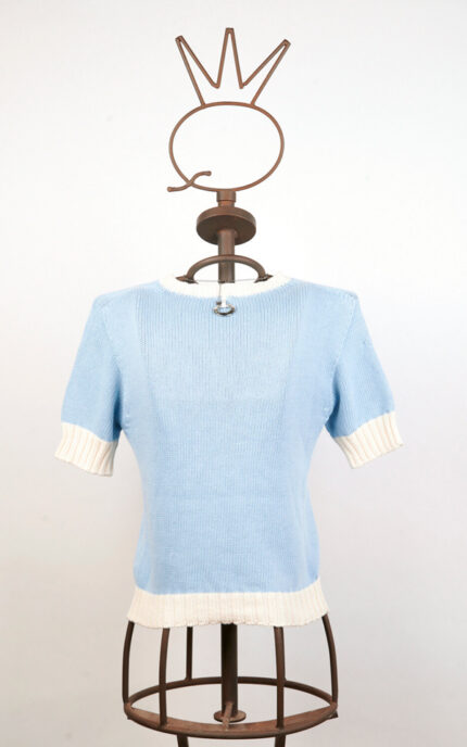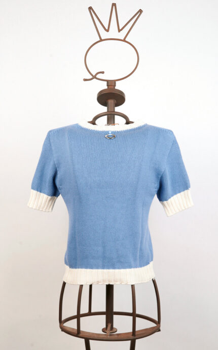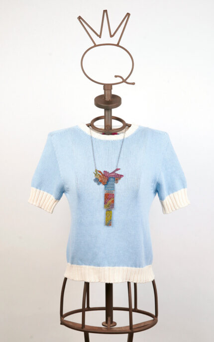Petite veste noire sans manches en coton, construite avec des pans superposés et des coutures apparentes qui définissent une silhouette gracieuse. Présente un décolleté américain et un dos partiellement découvert. La fermeture frontale est assurée par des boutons-pression appliqués sur des rubans colorés, qui remplissent une double fonction décorative et fonctionnelle. Le vêtement est embelli d’imprimés multicolores.