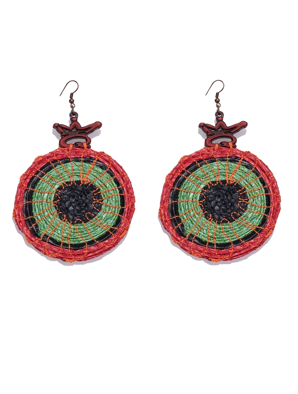Une paire originale de boucles d’oreilles crochets en métal hypoallergénique, en coton et raphia tissés d’une broderie géométrique en noir, vert et rouge. Petits logos avec couronne pvc.