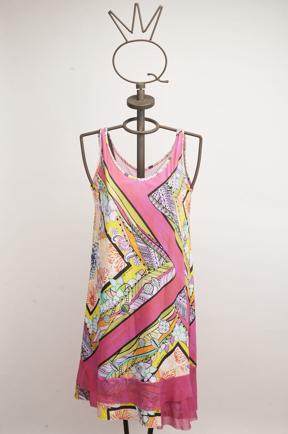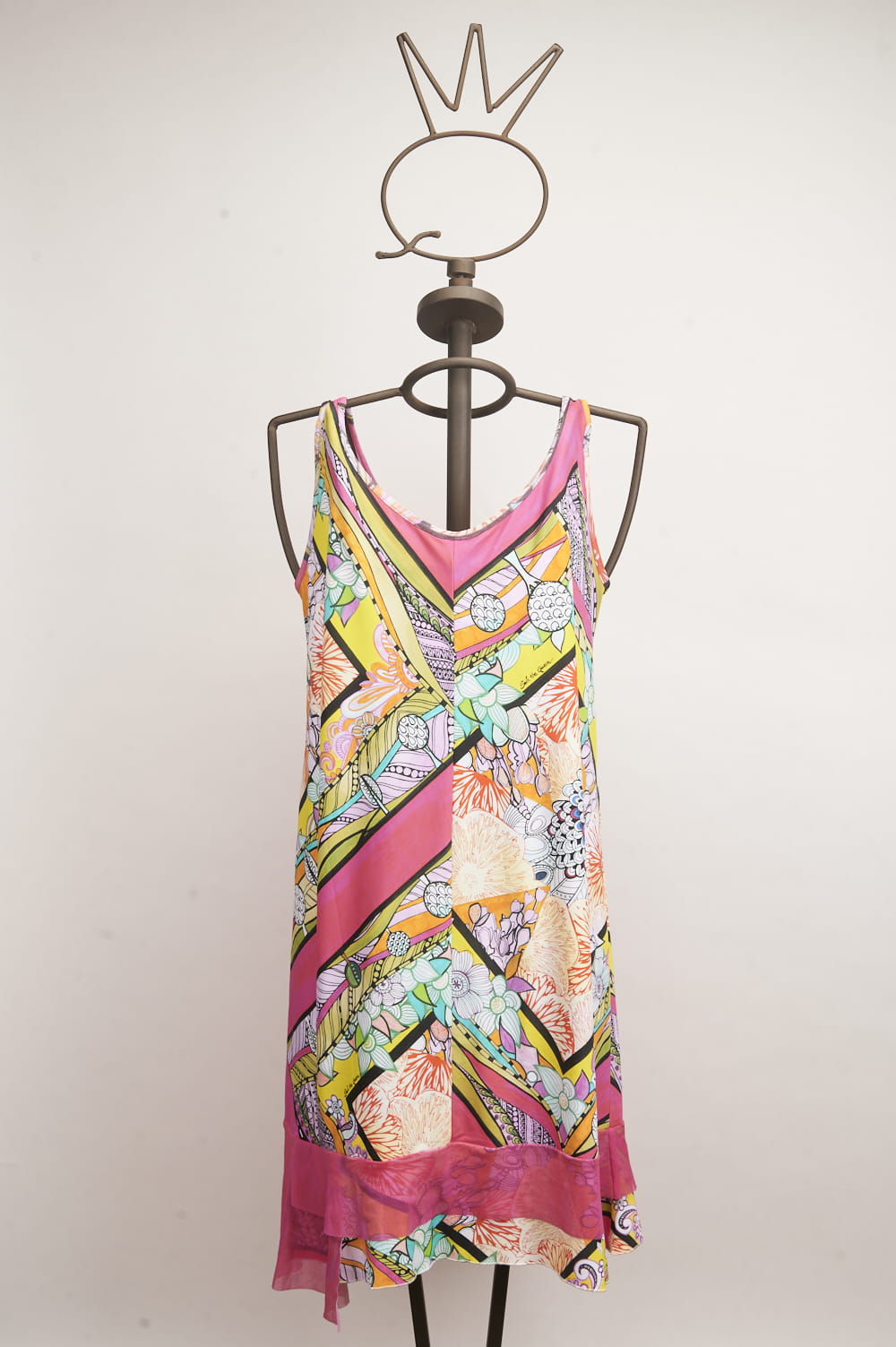 Abito corto in jersey elasticizzato con balze sul fondo in tulle fucsia. Il disegno foulard, a tema floreale, richiama le tonalità vivaci del capo: fucsia, verde acido, giallo e arancio, per un look scenografico e femminile.