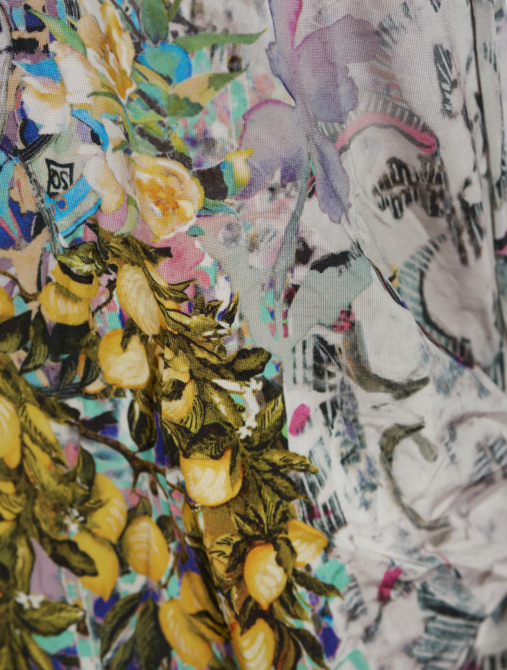 Abito corto elasticizzato con stampa limoni e cavallo. Tema “ POSITANO” Toni grigio perla con giallo e turchese.