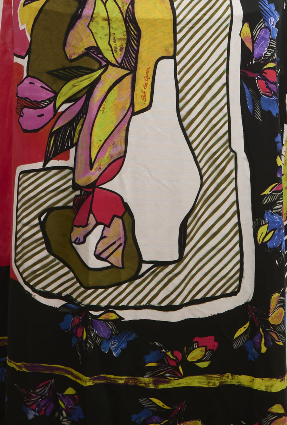 Abito estivo colorato su manichino, con motivi grafici vivaci e scollatura ampia, ideale per look casual e alla moda.
