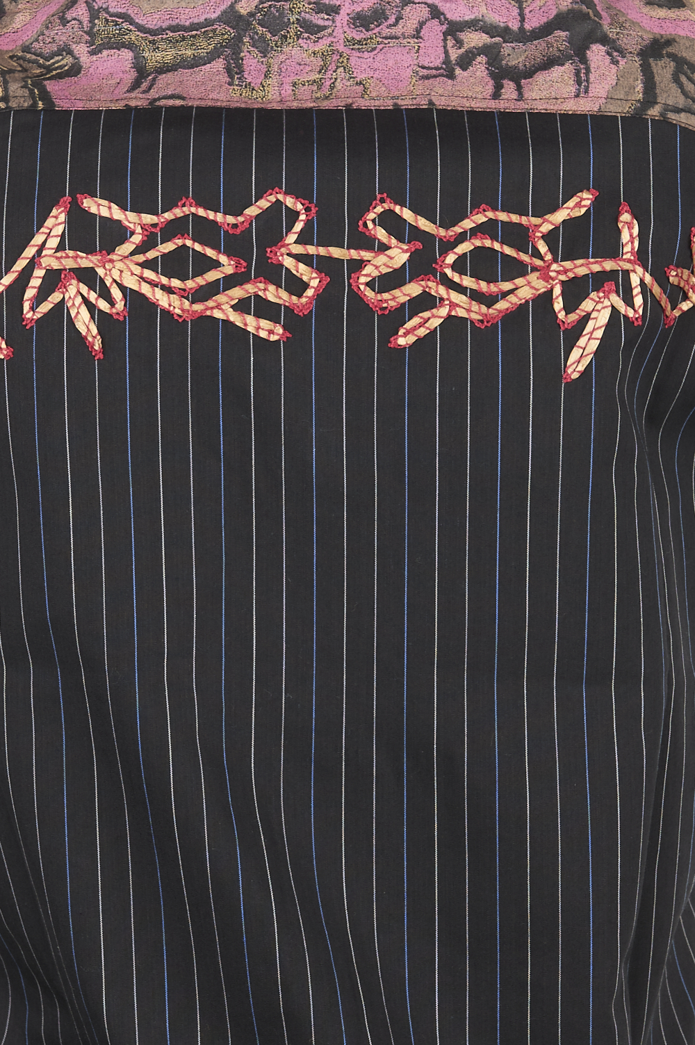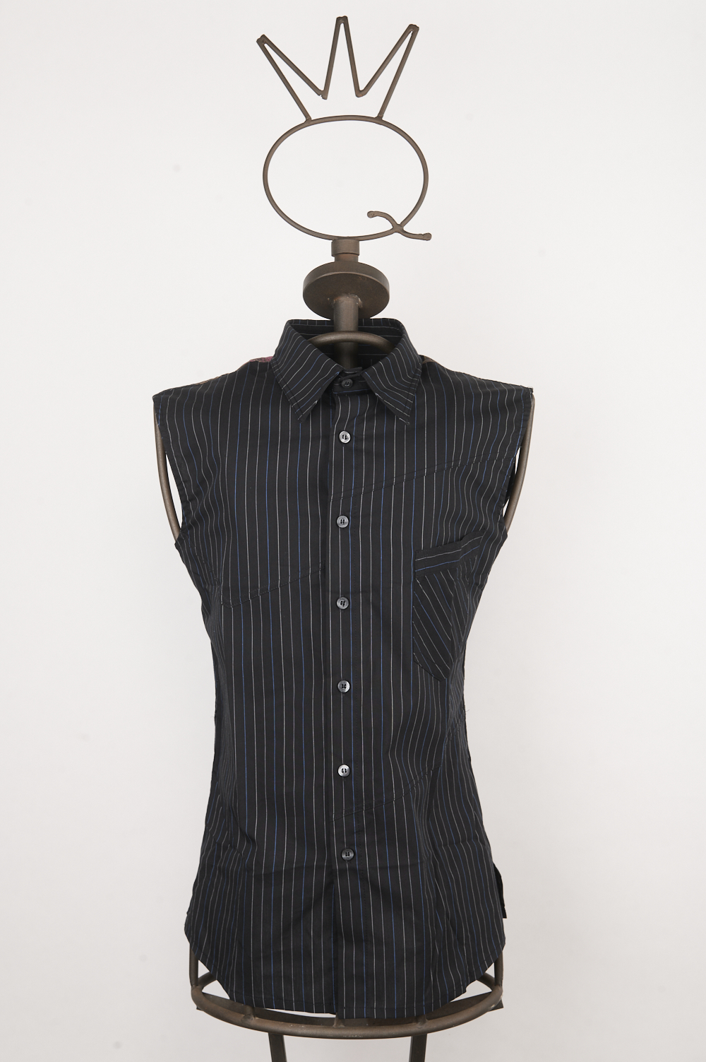 Camicia nera da uomo a righe bianche e blu, senza maniche realizzata in cotone elasticizzato. Si distingue per una particolare stampa sul dietro, con disegni primitivi e per un ricamo in rafia che aggiunge un dettaglio decorativo. Il taschino completa il design.