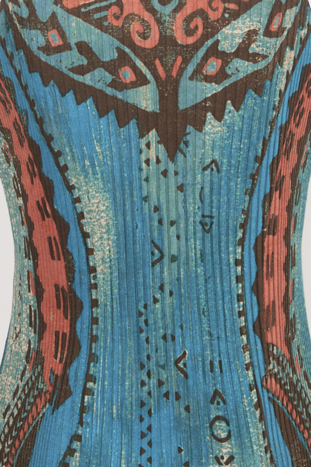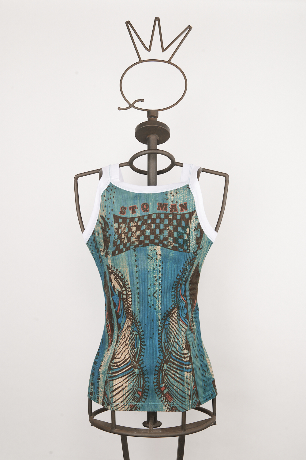 Canotta da uomo realizzata in cotone a costine, pensata per garantire comfort e libertà di movimento. Il capo è caratterizzato da una stampa esclusiva della linea Save the Queen Man declinata nelle tonalità blu pavone, coccio e marrone, che dona profondità cromatica e personalità al design. Il girocollo e il giro manica sono rifiniti con bordo in costina bianca, che evidenzia la costruzione del capo con un contrasto pulito e deciso.