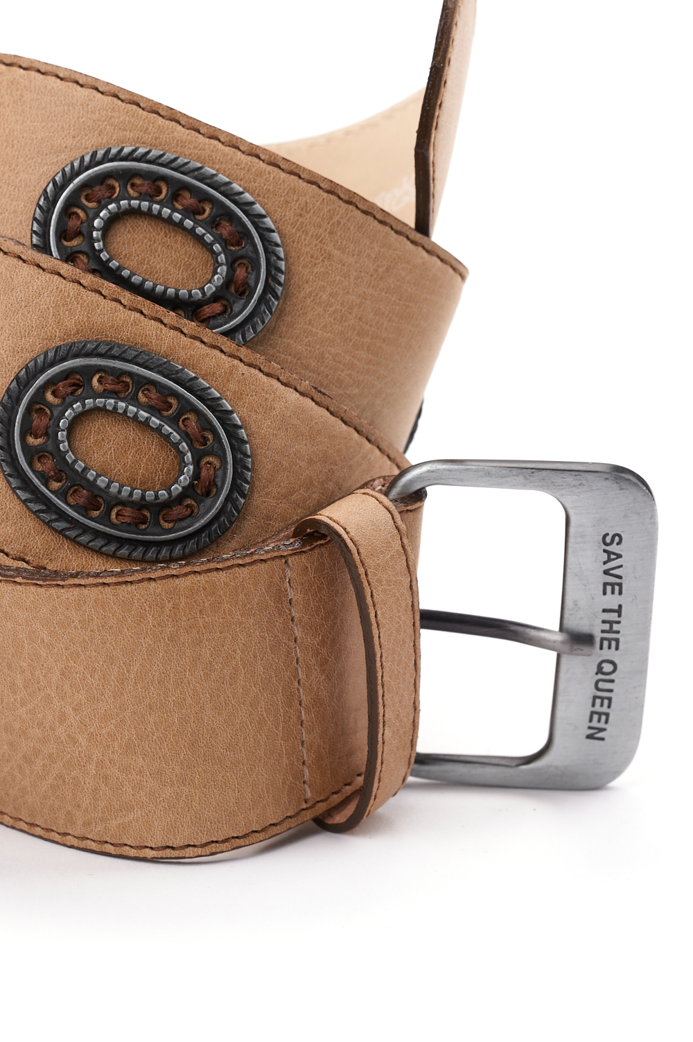 Cintura in vera pelle color beige effetto invecchiato, rifinita da impunture tono su tono che ne definiscono il profilo. Il design è impreziosito da sette borchie ellittiche in metallo lavorato e brunito, dall’aspetto materico e deciso. Maxi fibbia in metallo con finitura effetto graffiato e logo, per un tocco grintoso e contemporaneo.