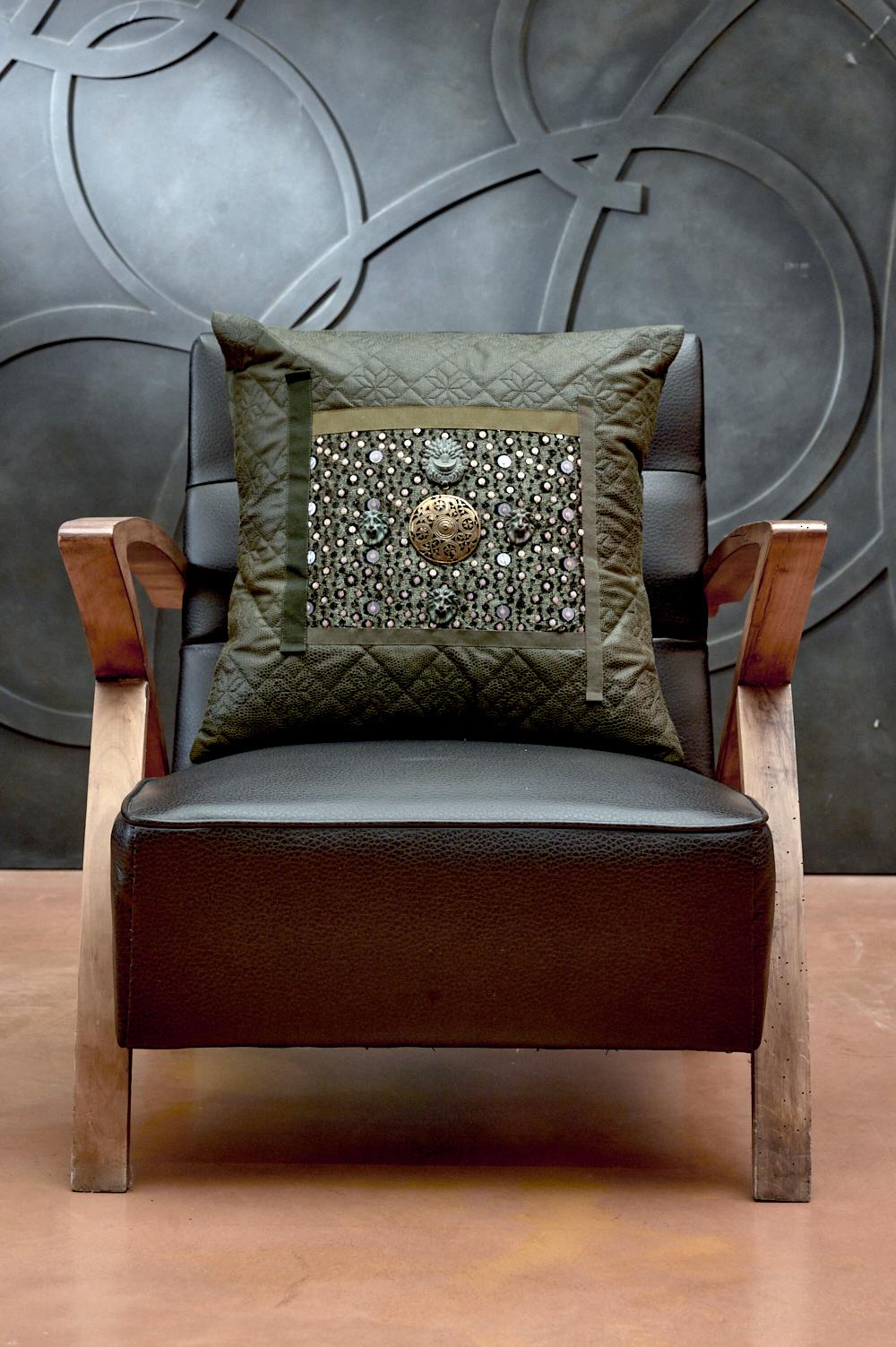 Un cuscino di ispirazione rinascimentale, dove materiali come pelle ecologica color verde olio, trapuntata con applicazioni di seta ricamata con paillettes e gros grain tono su tono, si fondono con dettagli preziosi: borchie in zama dorata antica con fregio floreale e suggestive teste di leone. Ogni elemento è scelto e applicato con attenzione, creando un prodotto unico che rimanda alla tradizione artistica fiorentina. Pensato per chi ama ambienti raffinati, questi cuscini trasmettono energia creativa e carattere, impreziosendo divani e poltrone con stile deciso.