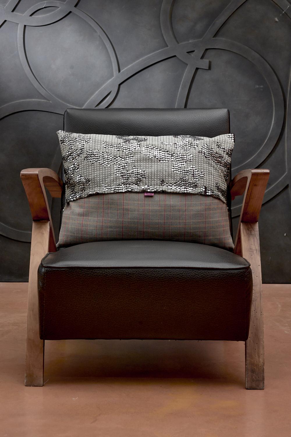 In seta color prugna, questo luminoso cuscino è ricamato con filo di seta color panna e paillettes dai riflessi metallici. Il retro è realizzato in tessuto principe di Galles nei toni del grigio e del rosso, pensato per arricchire ogni angolo della casa con tocchi di stile. L’effetto della combinazione tra materiali pregiati e decori ricercati trasforma questo cuscino in un protagonista dell’arredo.