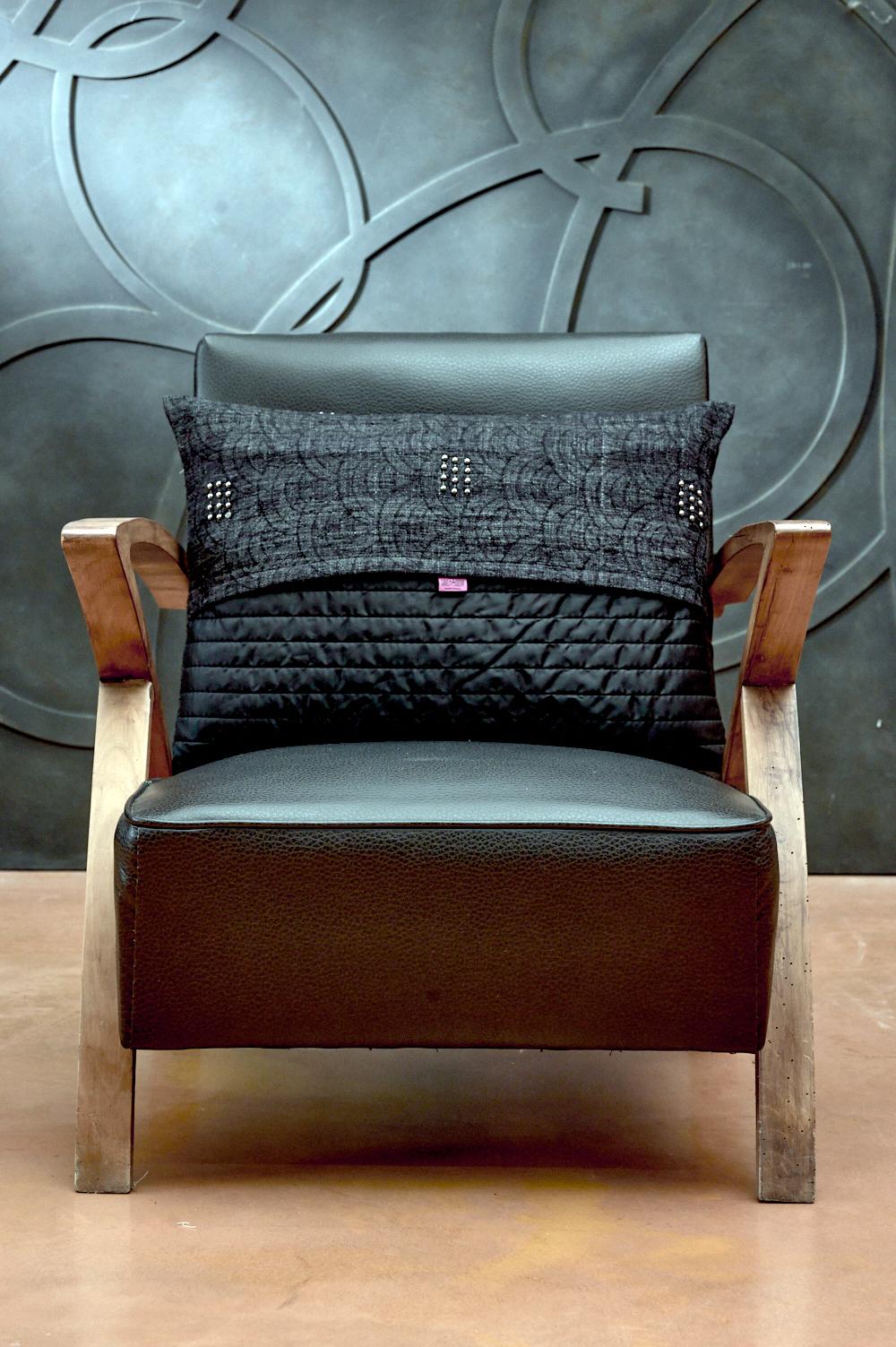 Sul fondo deciso di seta nero antracite, questo cuscino si distingue per una superficie lavorata con burette di seta, impreziosita da piccole sfere color metallo che donano un riflesso unico. Il retro trapuntato in nylon aggiunge consistenza e praticità. Pensato per aggiungere un accento contemporaneo alla casa, questo cuscino unisce manifattura artigianale e stile urbano.