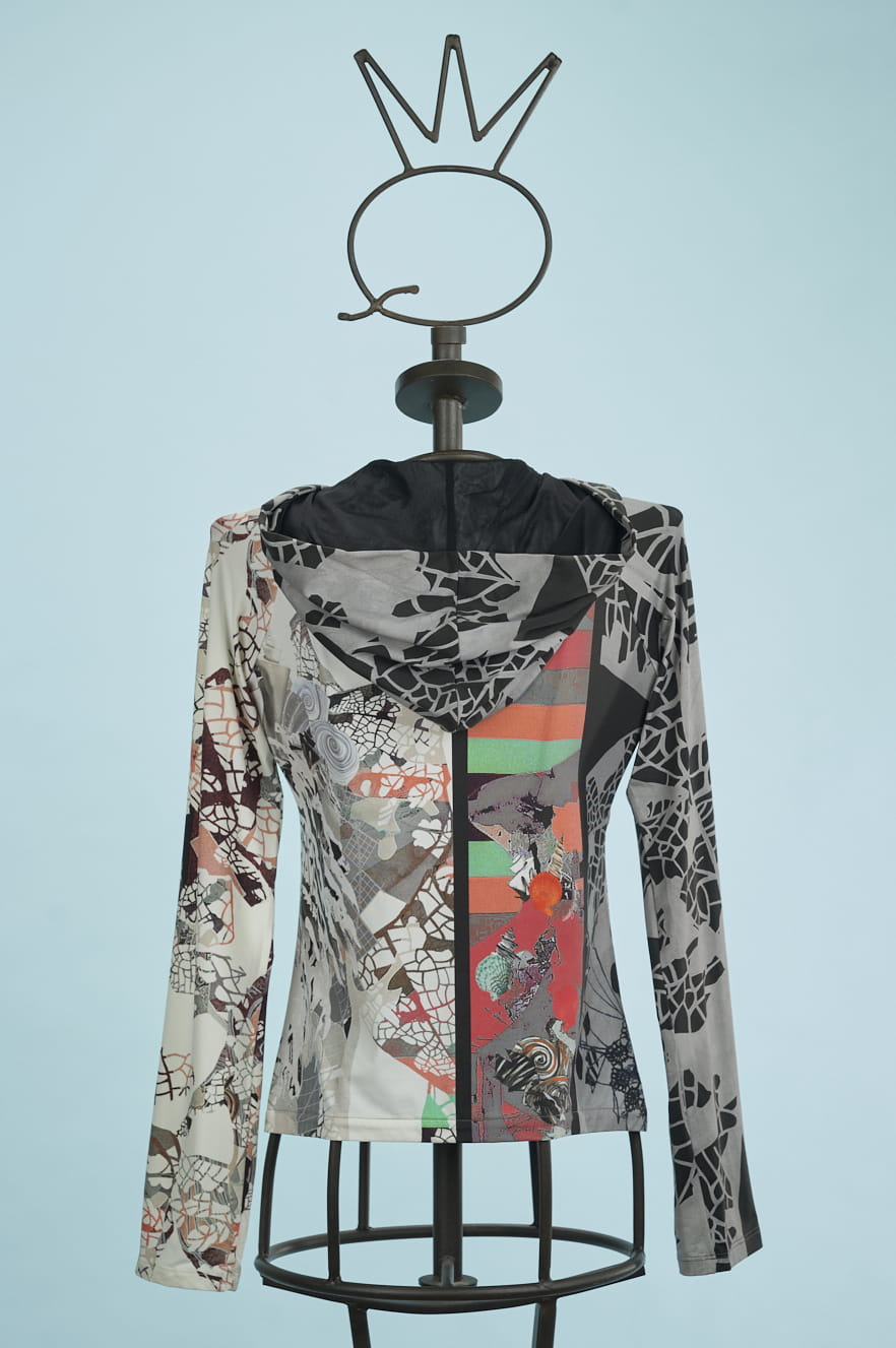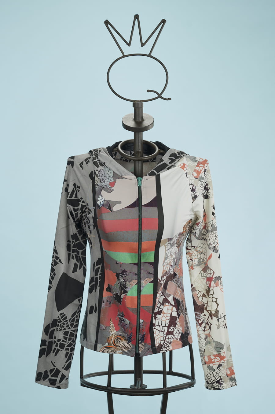 Una felpa in jersey elasticizzato stampato con un disegno esclusivo Save The Queen! nei toni del grigio, nero, rosso, arancio, panna e bordeaux. Si chiude con una cerniera. Ha un cappuccio.