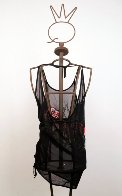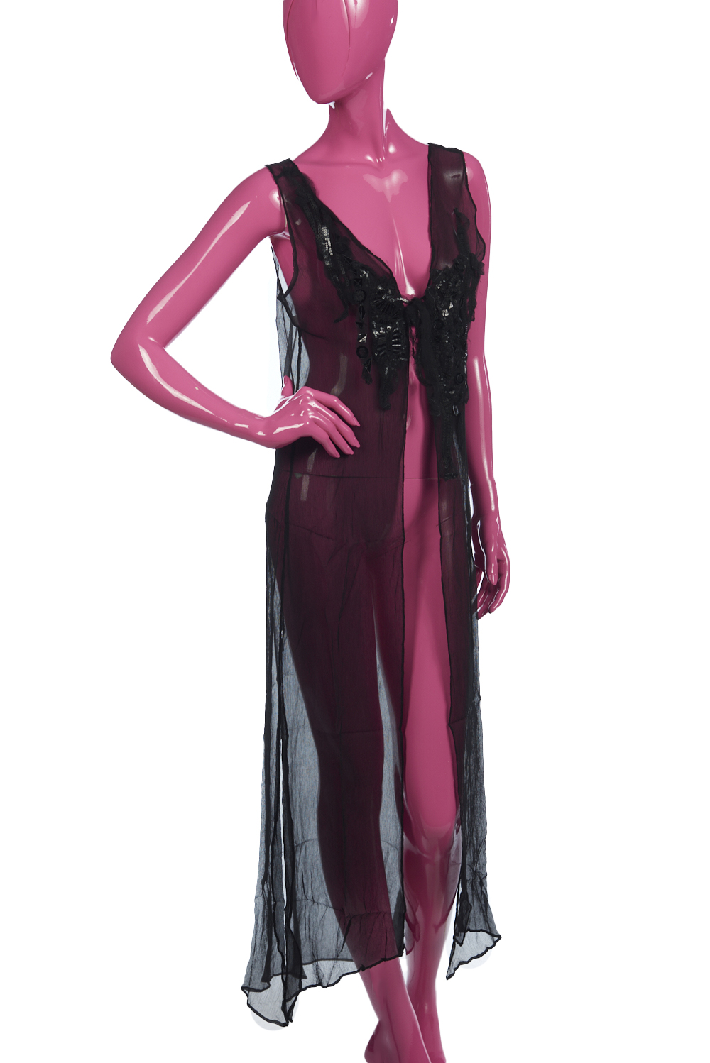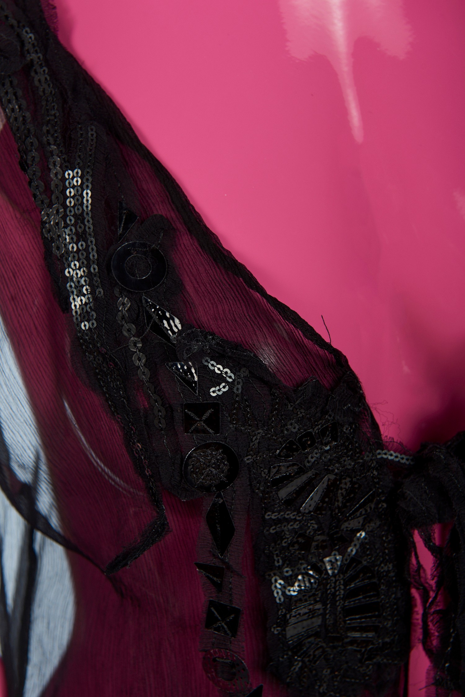 Un gilet lungo realizzato in pura seta crepon nera. Impreziosito da un ricamo di paillettes nere tagliate a laser. Si chiude con un fiocco.