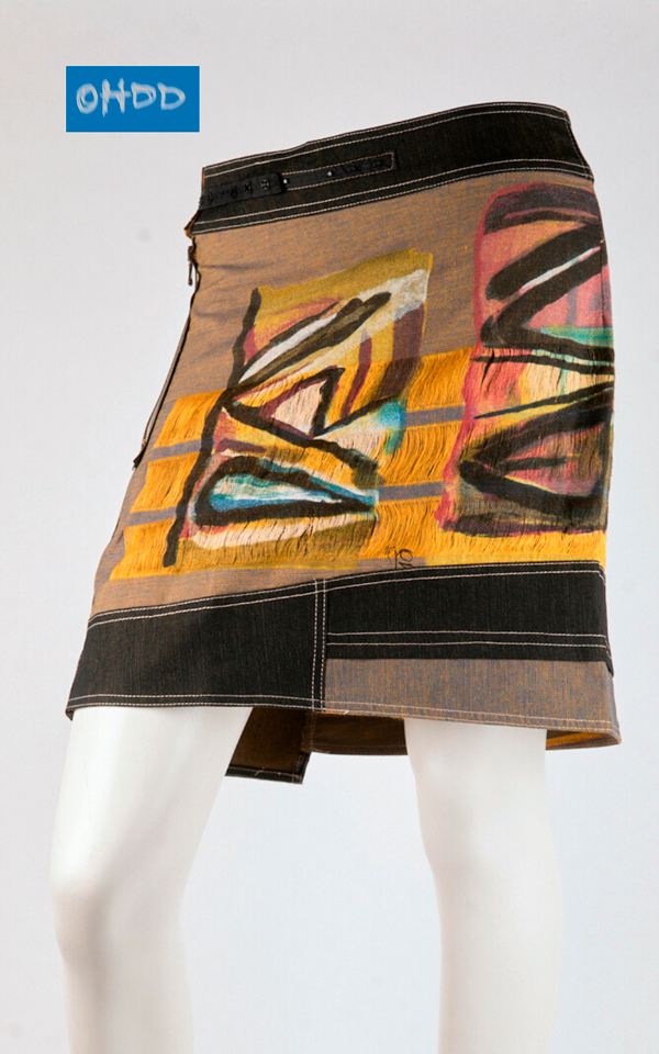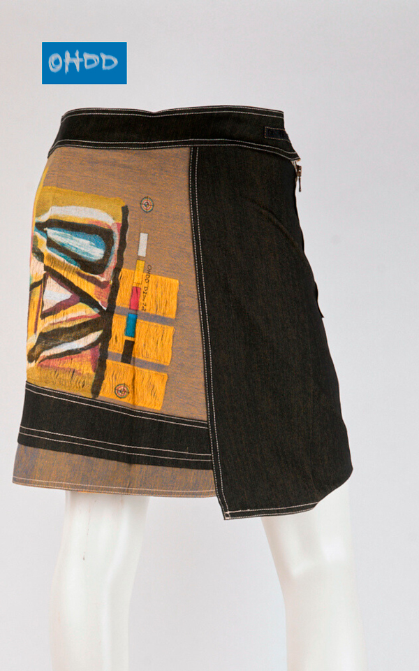Gonna corta in cotone dal tessuto particolare, con fili gialli intrecciati tra i neri che lasciano intravedere l’ordito in alcuni punti. Realizzata con pannelli cuciti e cuciture a vista, presenta un fondo asimmetrico. La chiusura laterale destra combina una cerniera e una serie di piccoli bottoncini a pressione applicati su nastro nero, unendo funzione decorativa e praticità. Il capo è impreziosito da esclusive stampe multicolore Ohdd.