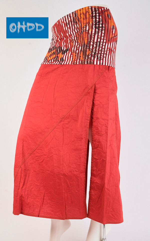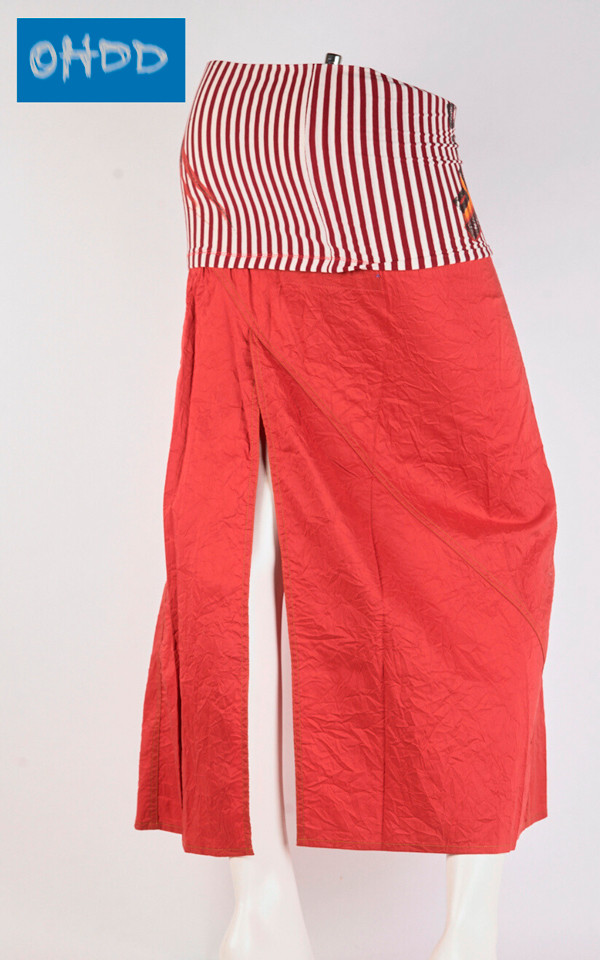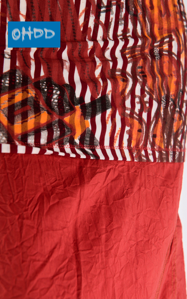 Gonna lunga rossa in cotone stretch dal lieve effetto stropicciato, caratterizzata da profondi spacchi sul davanti e sul retro, enfatizzati da impunture color ocra. A definire il punto vita, una fascia alta bianca a righe rosse, impreziosita dall’esclusiva stampa Ohdd, completa il design con un deciso richiamo etnico.