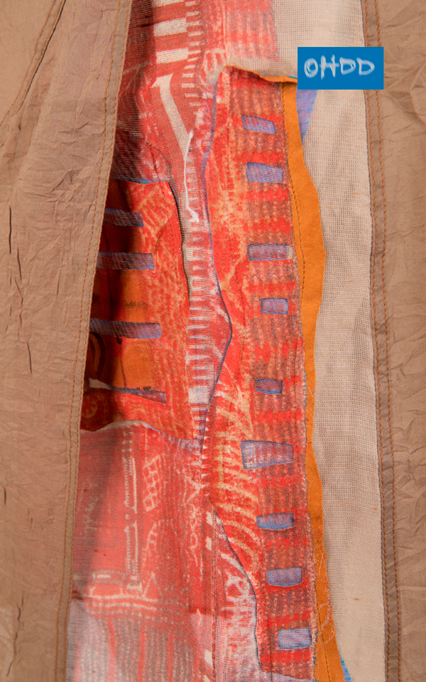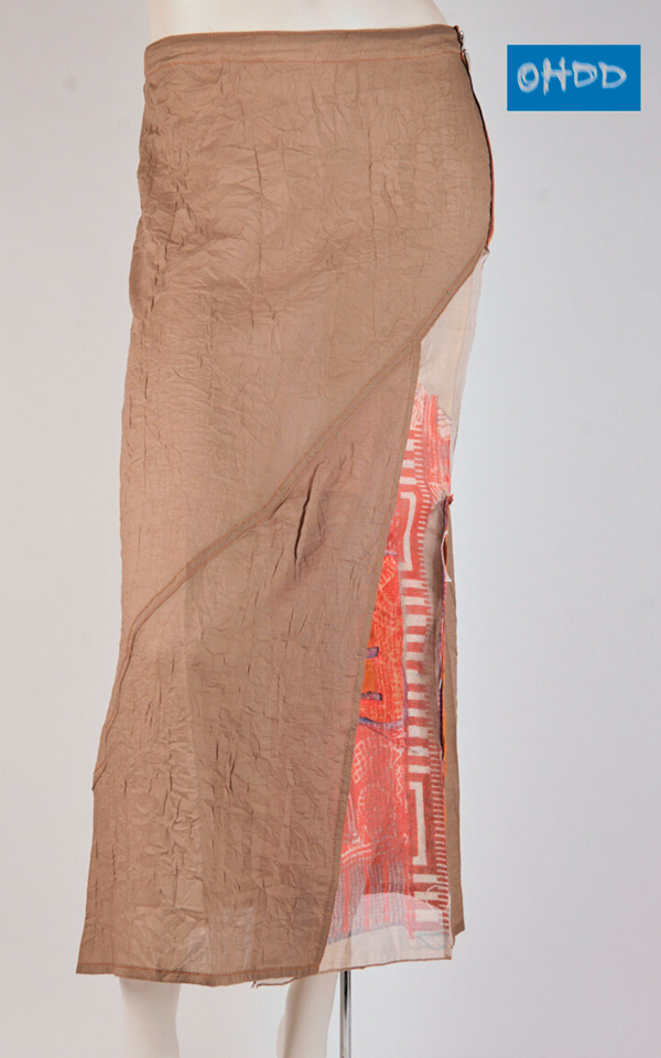 Gonna lunga in cotone color tortora con delicato effetto stropicciato. Un inserto sul fianco sinistro in tessuto semitrasparente è arricchito da applicazioni in vera pelle e dall’esclusiva stampa Ohdd. Il capo è rifinito con impunture a vista color ocra e presenta una chiusura laterale sinistra con cerniera esterna colorata.
