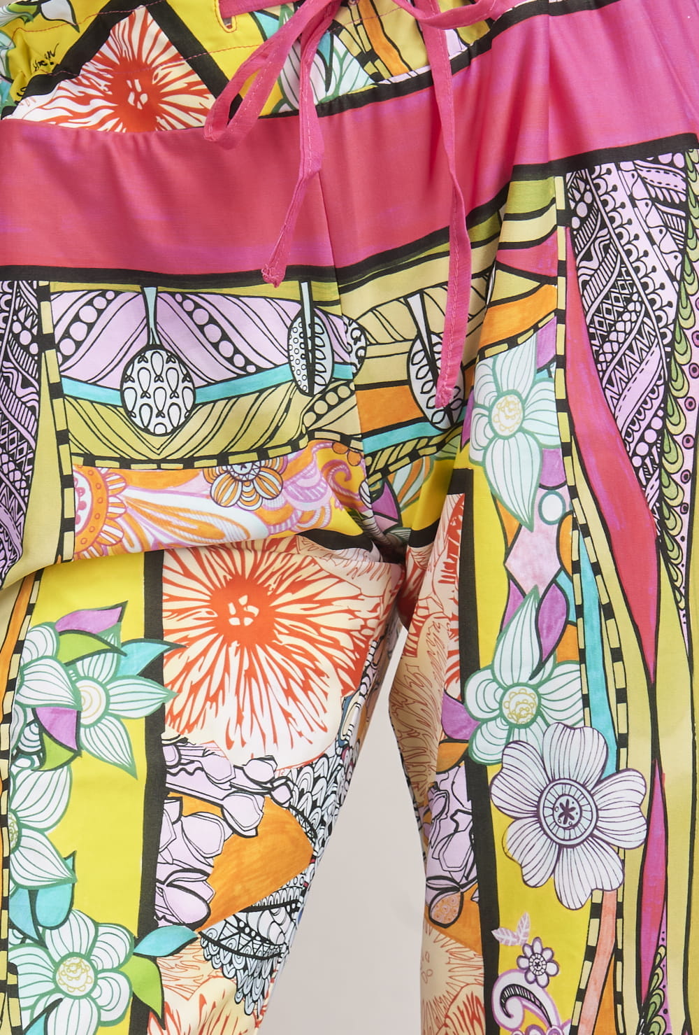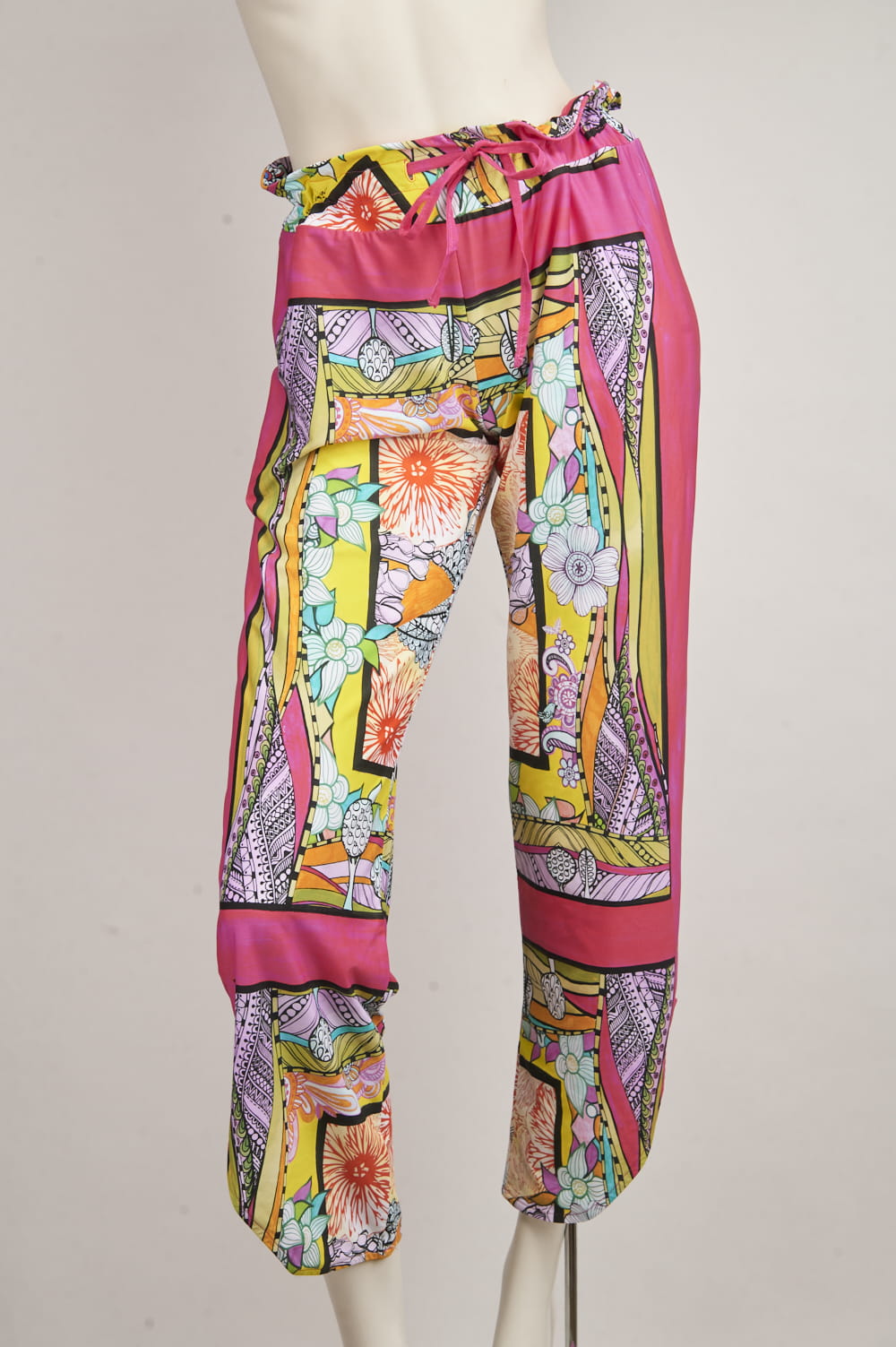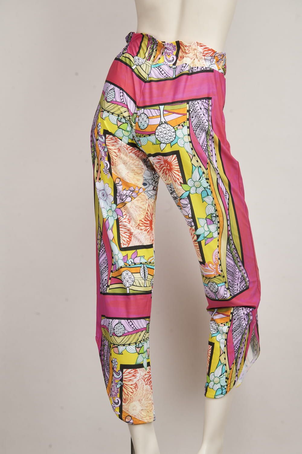 Pantalone in jersey elasticizzato con coulisse in vita e stampa floreale tipo foulard, declinata nei toni del fucsia, del verde acido, del giallo e dell’arancio. Il fondo è rifinito con spacchi, per un tocco dinamico e femminile, ideale da abbinare a top coordinati.