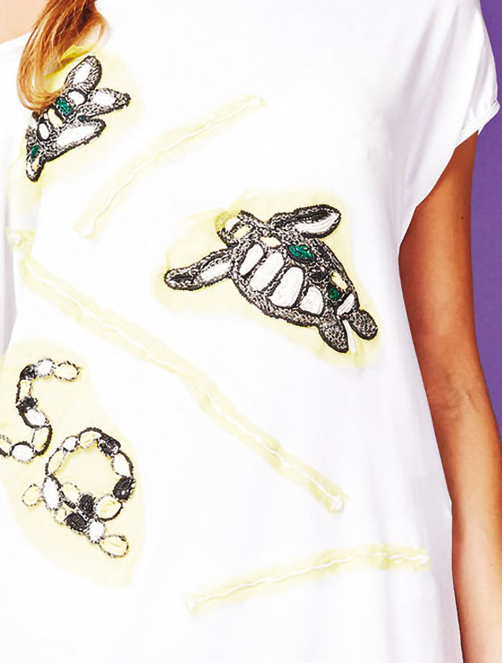 Una tunica bianca realizzata in comodo tessuto elasticizzato con ampio scollo a barca e maniche corte. Impreziosita da un esclusivo ricamo tessile con paillettes, nei toni prevalenti del giallo e del nero. Coordinata alla serie dedicata agli animali del mare. Bordi elasticizzati.