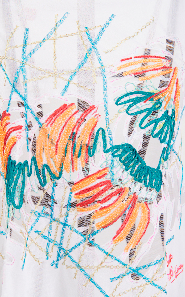 Tunica in tulle bianco dal taglio monospalla, con treccia al collo che dona sostegno e un dettaglio di stile moderno. La linea è svasata sul fondo per creare movimento e leggerezza ad ogni passo, rendendola perfetta sia come tunica sia come mini abito, a seconda dell’abbinamento. Il capo è impreziosito da un ricamo con paillettes che raffigura una gallina, per un tocco ironico e luminoso in pieno stile Save the Queen.