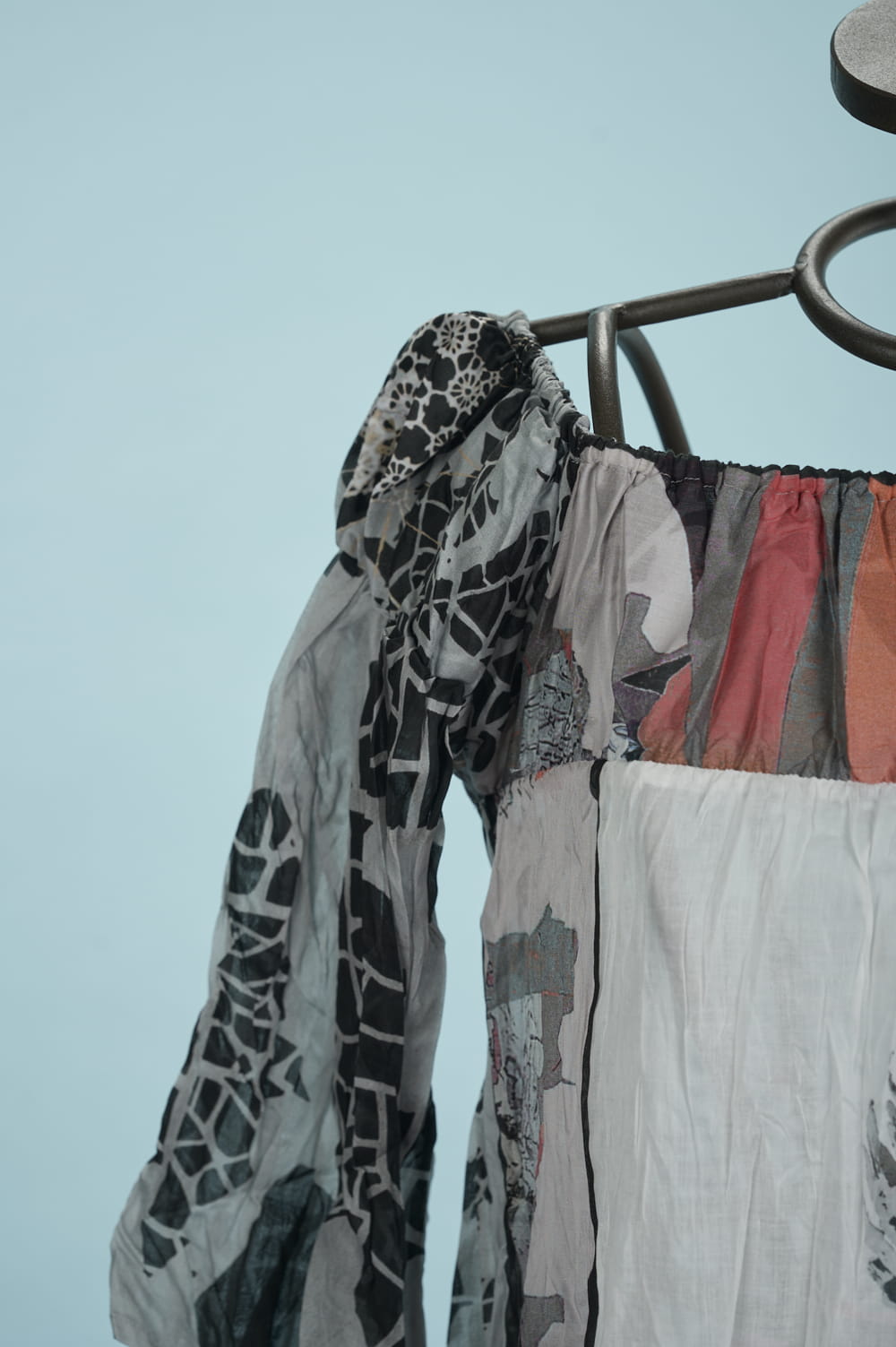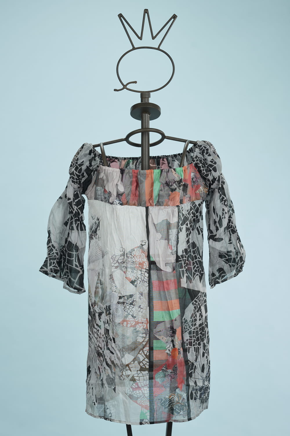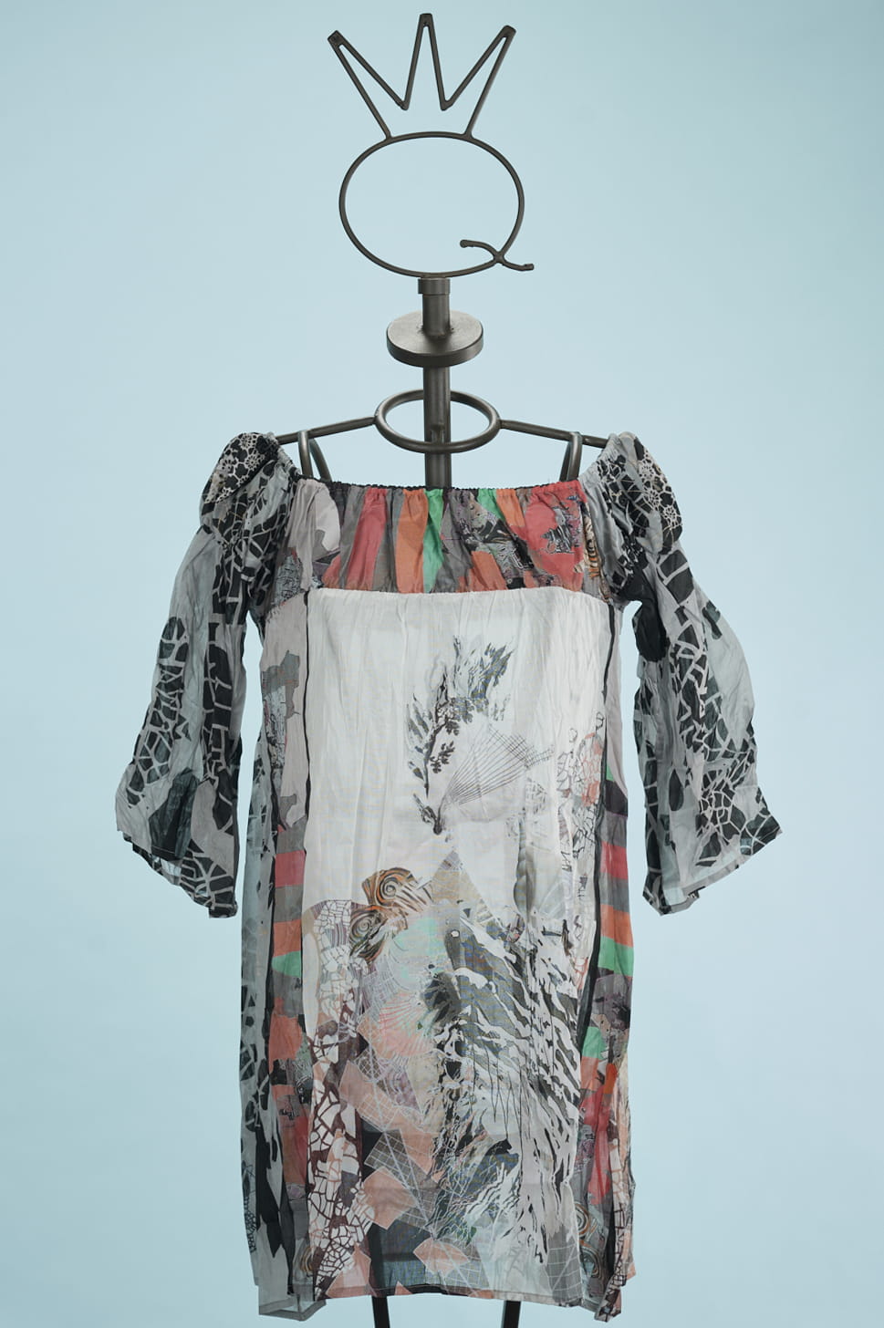 Una tunica in cotone finissimo stampato con un disegno esclusivo Save The Queen! nei toni del nero, grigio, rosso, arancio. Maniche a tre quarti. Scollo rettangolare con elastico.