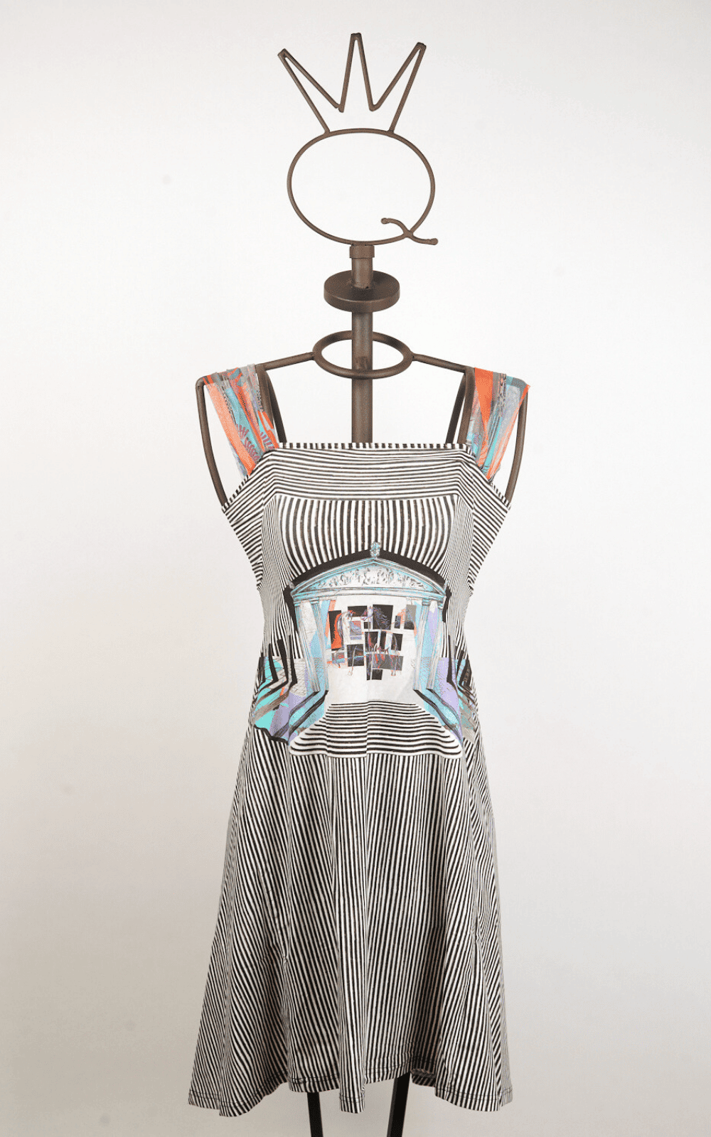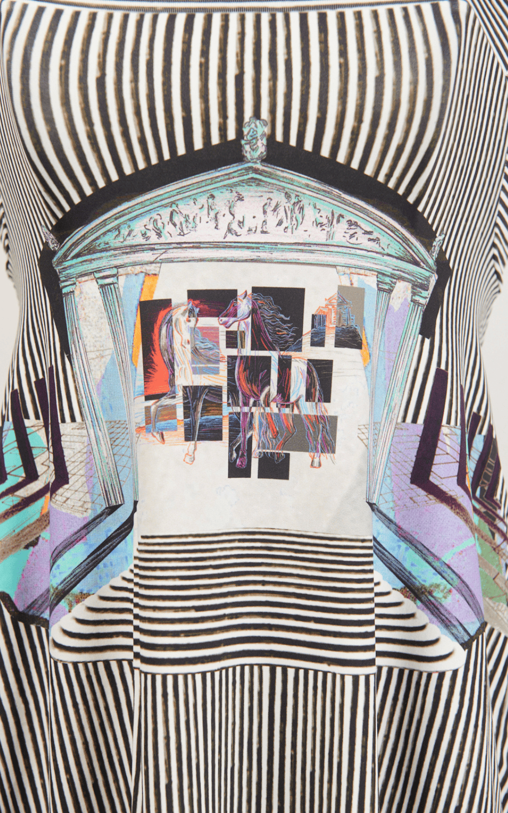 Vestito midi in morbido tessuto stretch a righe bianche e nere, arricchito da una stampa multicolore sul davanti ispirata all’antica Grecia. Le ampie spalline in tulle stampato coordinato completano il modello con leggerezza e carattere. La costruzione a pannelli, disegnata per seguire forme e direzioni diverse, dona all’abito una linea svasata e un raffinato effetto asimmetrico, con il retro leggermente più lungo.